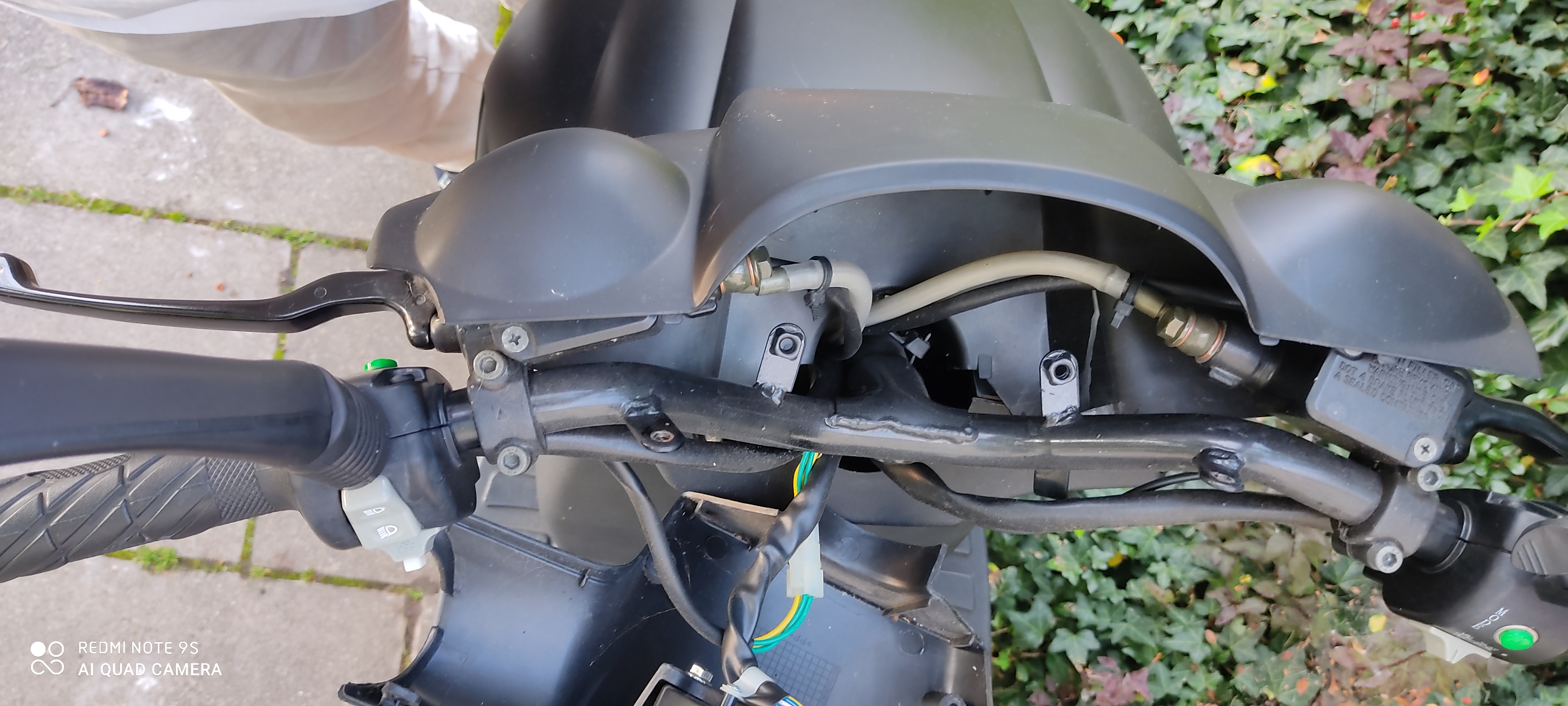 Am besten ein paar Kabelbinder besorgen, auch stärkere für die Kabel welche am Steuerkopf entlang laufen. Tja, die vordere Batterieabdeckung muß auch ab - zuerst die linke und rechte Schrauben lösen (Ohren) dann die anderen beiden. Die Ohren abspreitzen und die vordere Abdeckung unten abziehen. Dann den Gepäckhaken lösen sowie alle Schrauben von der schwarzen Seite vordere Verkleidung. Die Rosette vom Zündschloß läßt sich nach vorn heraushebeln. Achtung die unteren beiden Schrauben links und rechts von der vorderen Verkleidung sind etwas länger. Vielleicht muß die vordere Schraube (die vom Vorderrad vollgespritzt wird) von der Wanne (untere Verkleidung auch 'raus. Jetzt weißt du auch wie man an die Glühlampen 'rankommt.