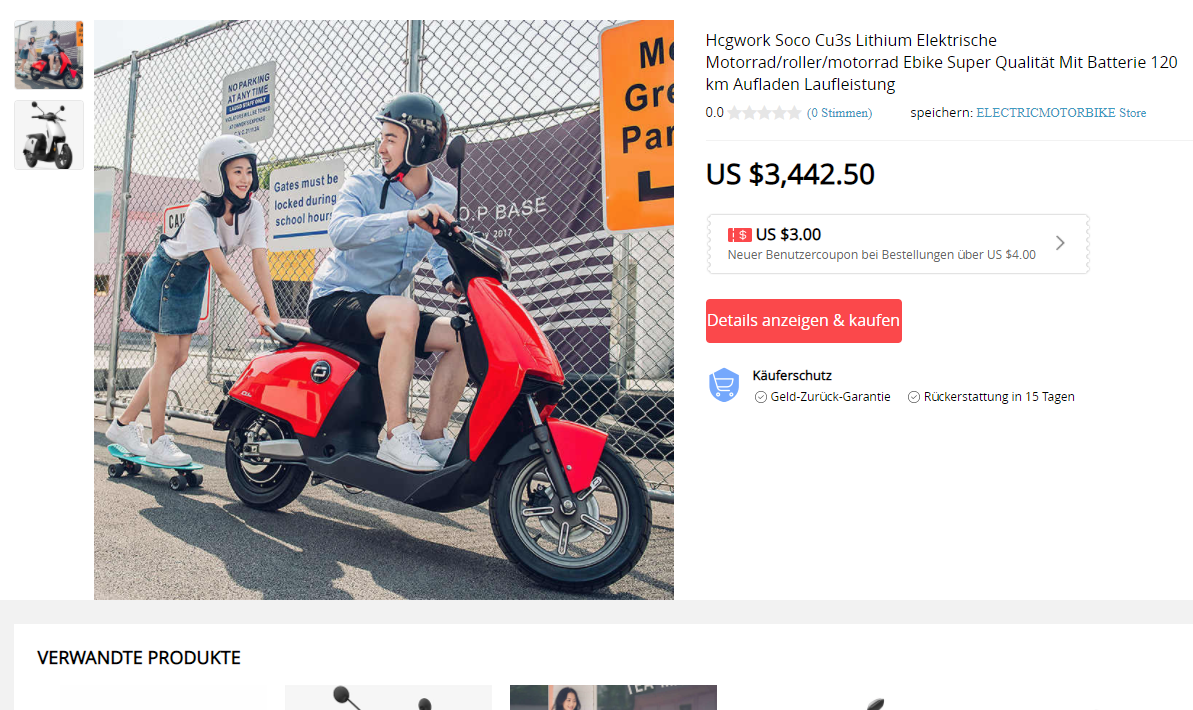 - Roller: Super Soco CU3S (Messefahrzeug)
