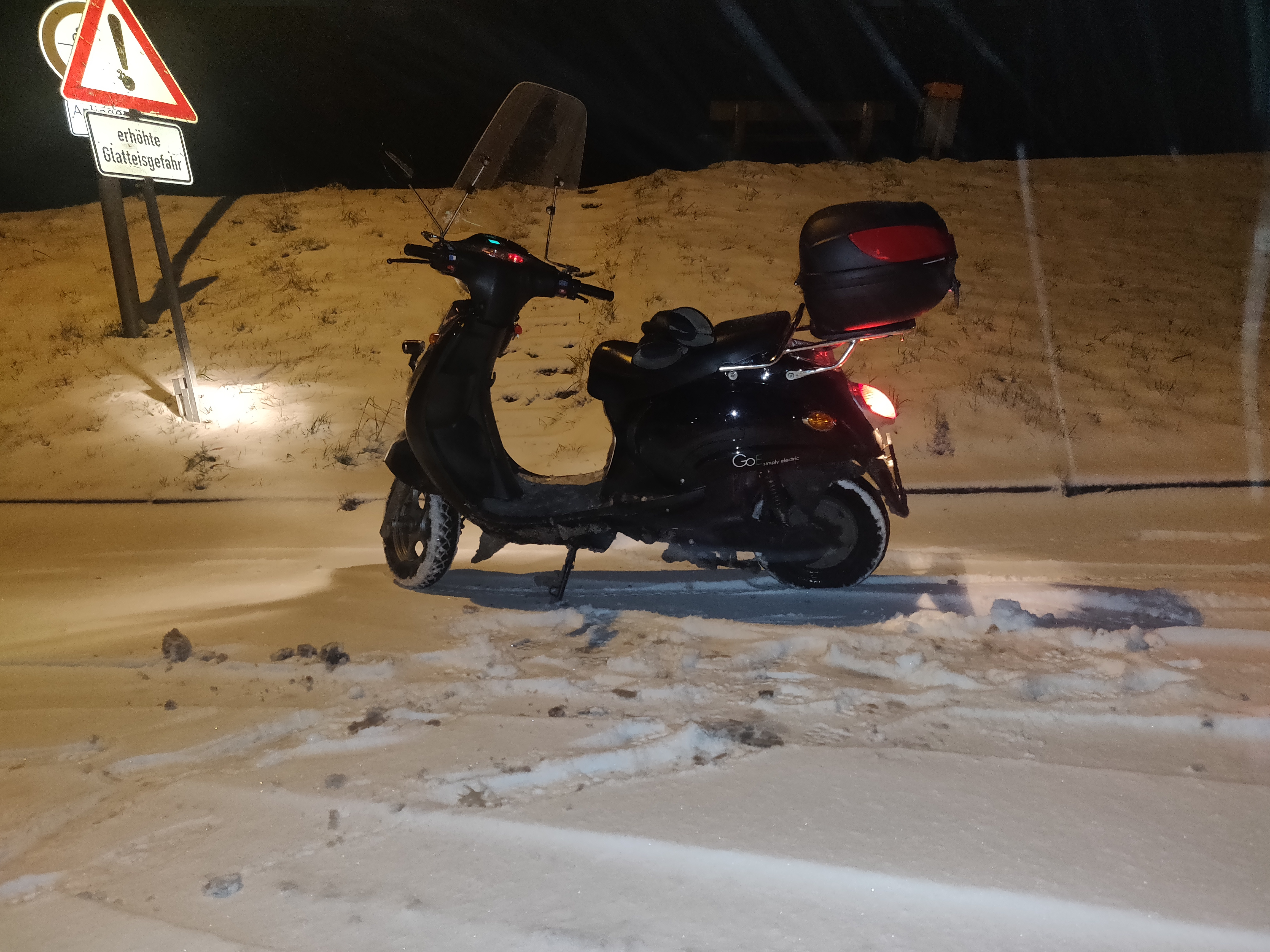 Bei 8 Grad eine Proberunde gedreht, laut Tacho fehlen ca. 5 km/h bei Vmax, aber das kann ja auch am Wetter liegen. Verbrauch und Reichweite passen. Luftdruck an Ende der Fahrt auf 2,6 bar angepasst. Luft für umsonst gab es erst an der 3.Tankstelle, Shell will jetzt Geld und Aral war kaputt.