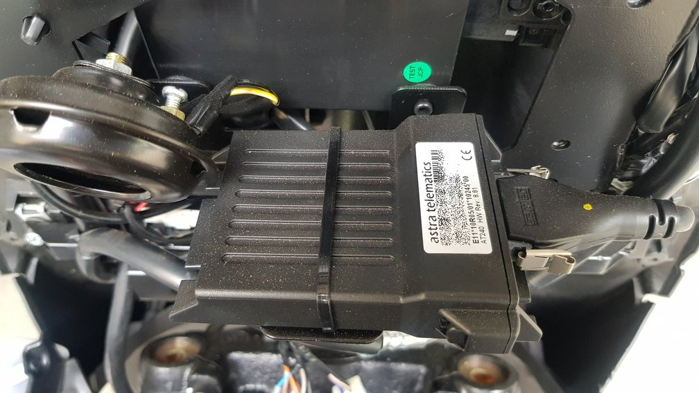 Ein weiteres gesprächiges Bauteil in den Rollern ist das Telemetriemodul, verantwortlich für den GPS-Empfang und die Kommunikation des Rollers mit den Servern von Silence (gilt auch für die SEATs) über Mobilfunk (die erforderliche SIM-Karte befindet sich ebenfalls dort). Es sitzt hinter der Frontschürze recht prominent neben der Hupe mittig (dahinter befindet sich die ECU-Zentraleinheit des Rollers) und hat hinter der Plastik guten Empfang.