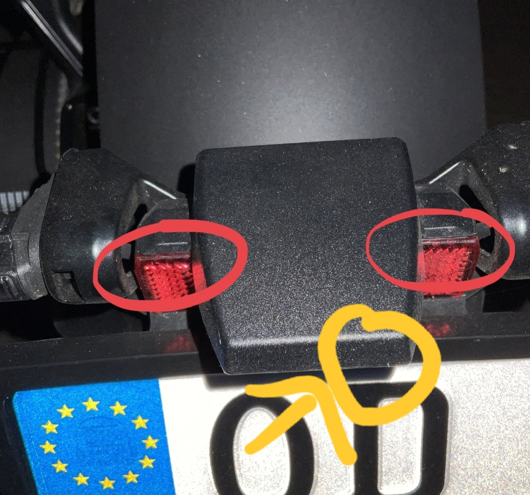 schwarze LED Abdeckung der Kennzeichenleuchte, oberhalb des roten Katzenauges, provisorisch einen Holzsplitter zwischen Abdeckung und Katzenauge rein gesteckt
