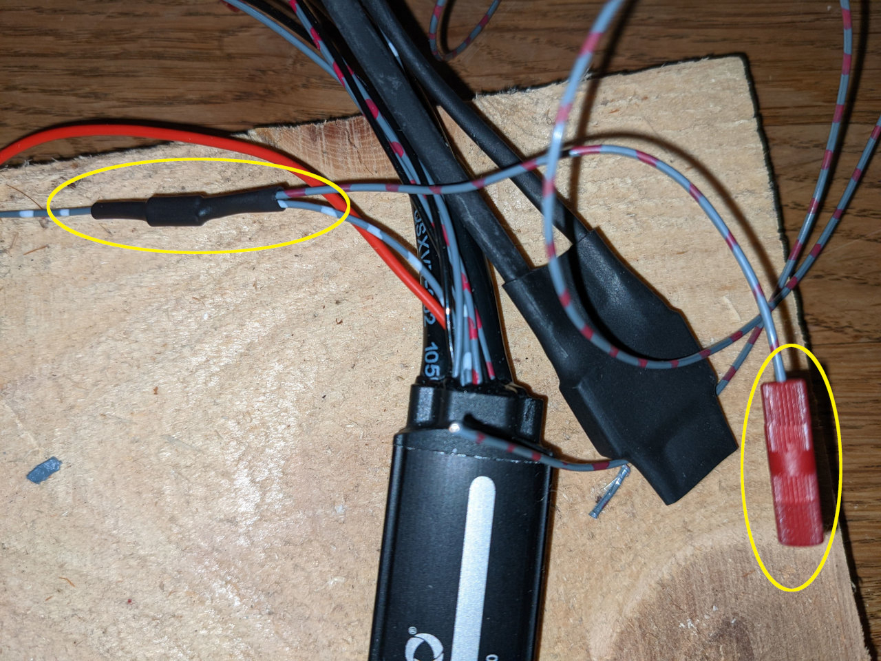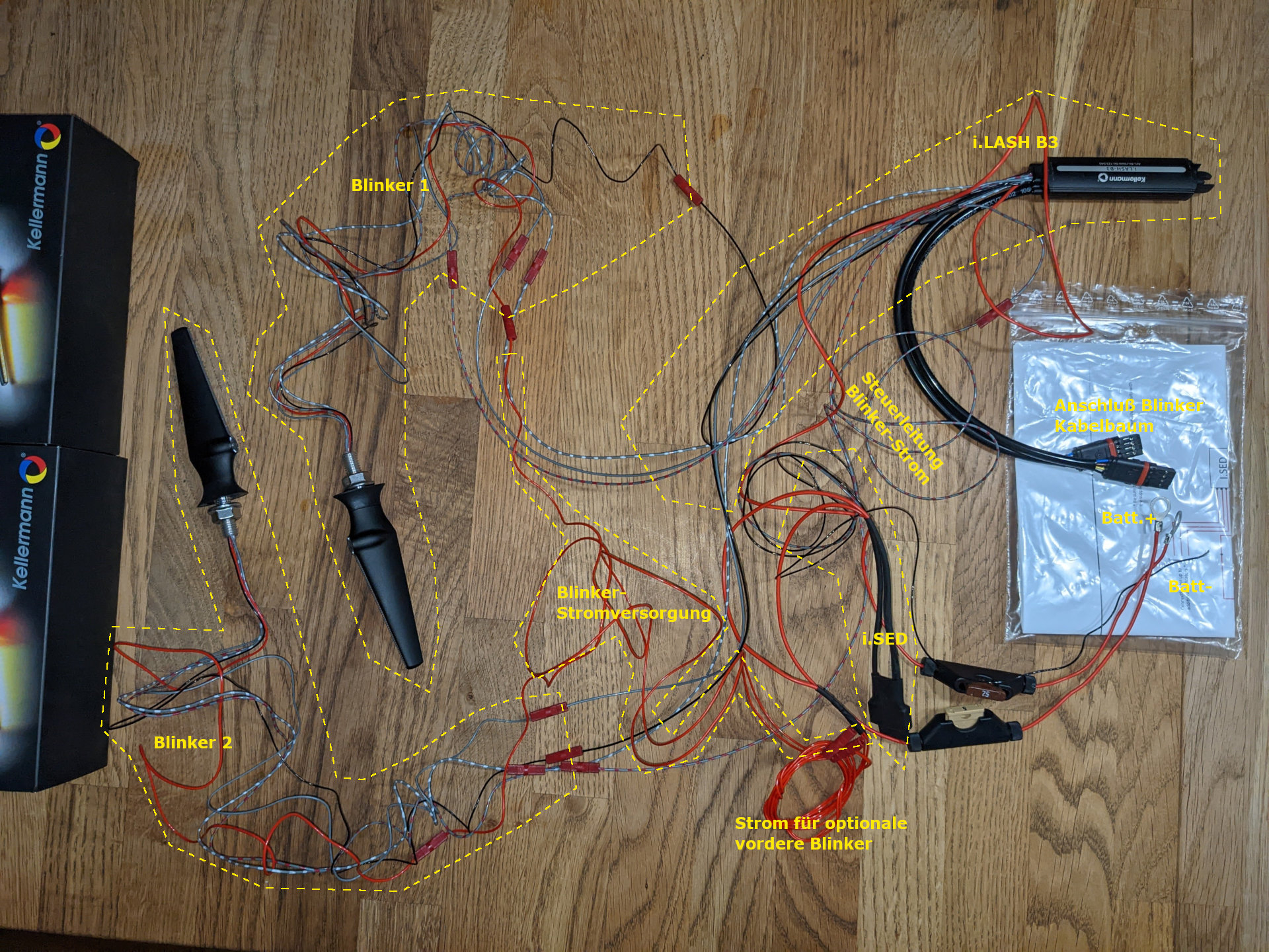 Rechts im Bild die fünf anzuschliessenden Kabel. Zweimal rote an Batterie +, einmal schwarz dünn an Batterie -, sowie zwei Systemstecker an die BMW Blinkerstecker. Dann muss das alles funktionieren, sonst habe ich ein Problem. Standby Warnblinker wird nicht gehen, dazu muss ich das i.SED Modul nochmal tauschen, sobald das Upgrade verfügbar ist. Alternativ kann man eine sehr einfache Minischaltung machen, wenn man Lust hat, aber das lasse ich.