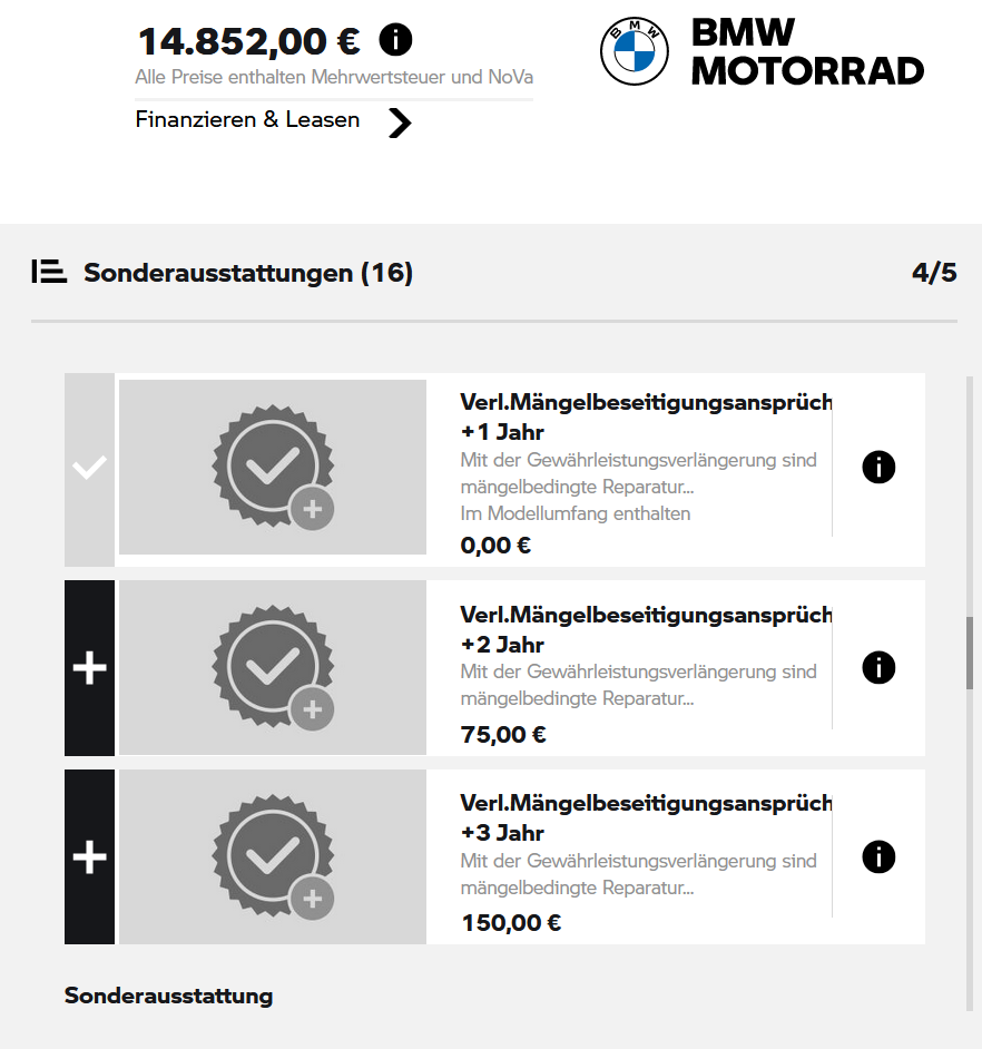 die Form hat mich zunächst auch abgeschreckt. Das Original ist einwandfrei und die Versicherung wird in anderen BMW Motorrad-Foren empfohlen. Ich hoffe natürlich trotzdem, dass im vierten und fünften Jahr kein Garantie- bzw. Versicherungsfall eintritt. Wenn ich dieses Zweirad wirklich so lange behalten sollte…