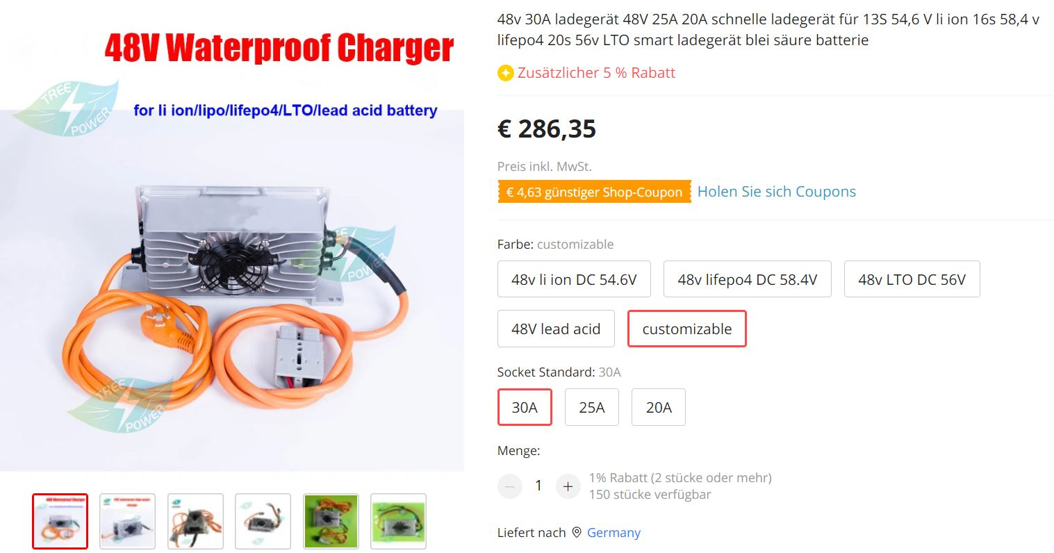 Den von @Eapoe vorgestellten Schnelllader mit den Kennzahlen 2000 W, 30 A, 58,4 V am Sonntag bestellt und am Dienstag Mittag in Empfang genommen.