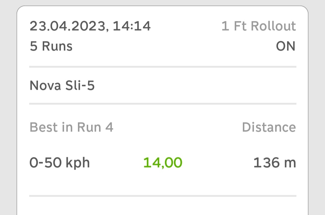 Falls es jemanden interresiert: Ich hab heute nochmal professionelle 0 auf 50 kmh Messungen (mit der RaceBox) gemacht. Das ist ja immer der Wert, der bei Beschleunigungen von E-Rollern gern herangezogen wird.
