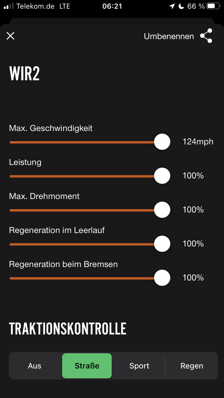 Du siehst doch, wie ich es eingestellt habe für das zweistufige Rekuperieren? 66% im Leerlauf, 100% beim Bremshebel ziehen. Was ist daran unklar?