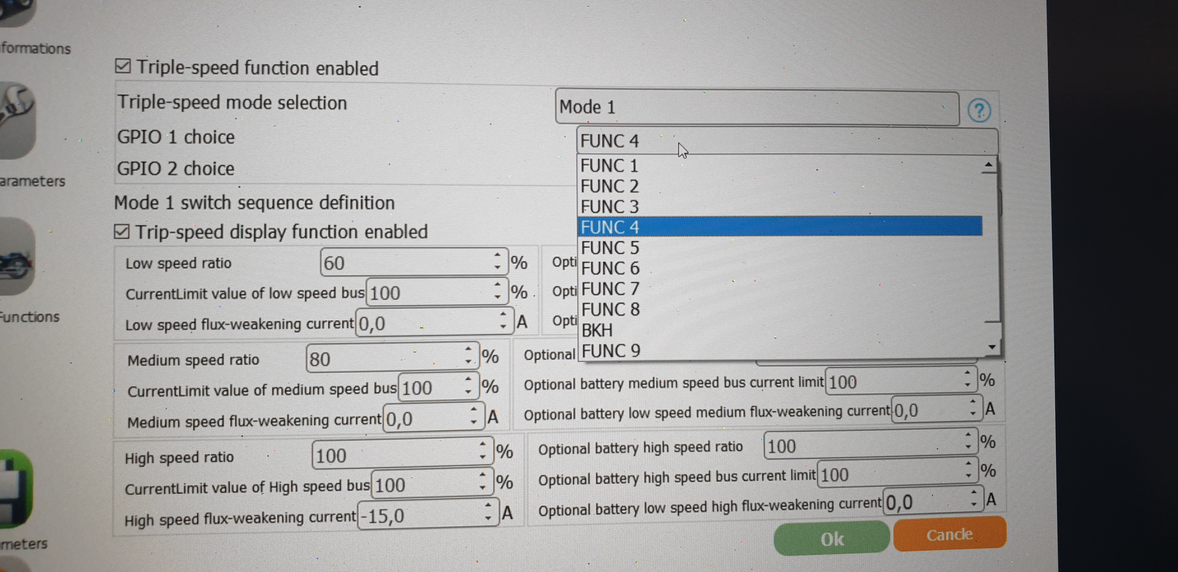 + Den Gangwahlschalter wollte ich ursprünglich in den Stufen 1, 2, 3 anschließen - Programmieren - und auch über Mode 1, 2, 3 gerne in der Anzeige haben. Ist mir nicht gelungen. Ich habe die Eingänge L und H in allen möglichen Kombinationen beschaltet sowie die Software hierzu in vielen Kombis. durchprobiert ... ging nicht ... also habe ich jetzt "Mode 2" für Low Speed und keine Mode Anzeige " " für High Speed. Damit bin ich zudrieden ...