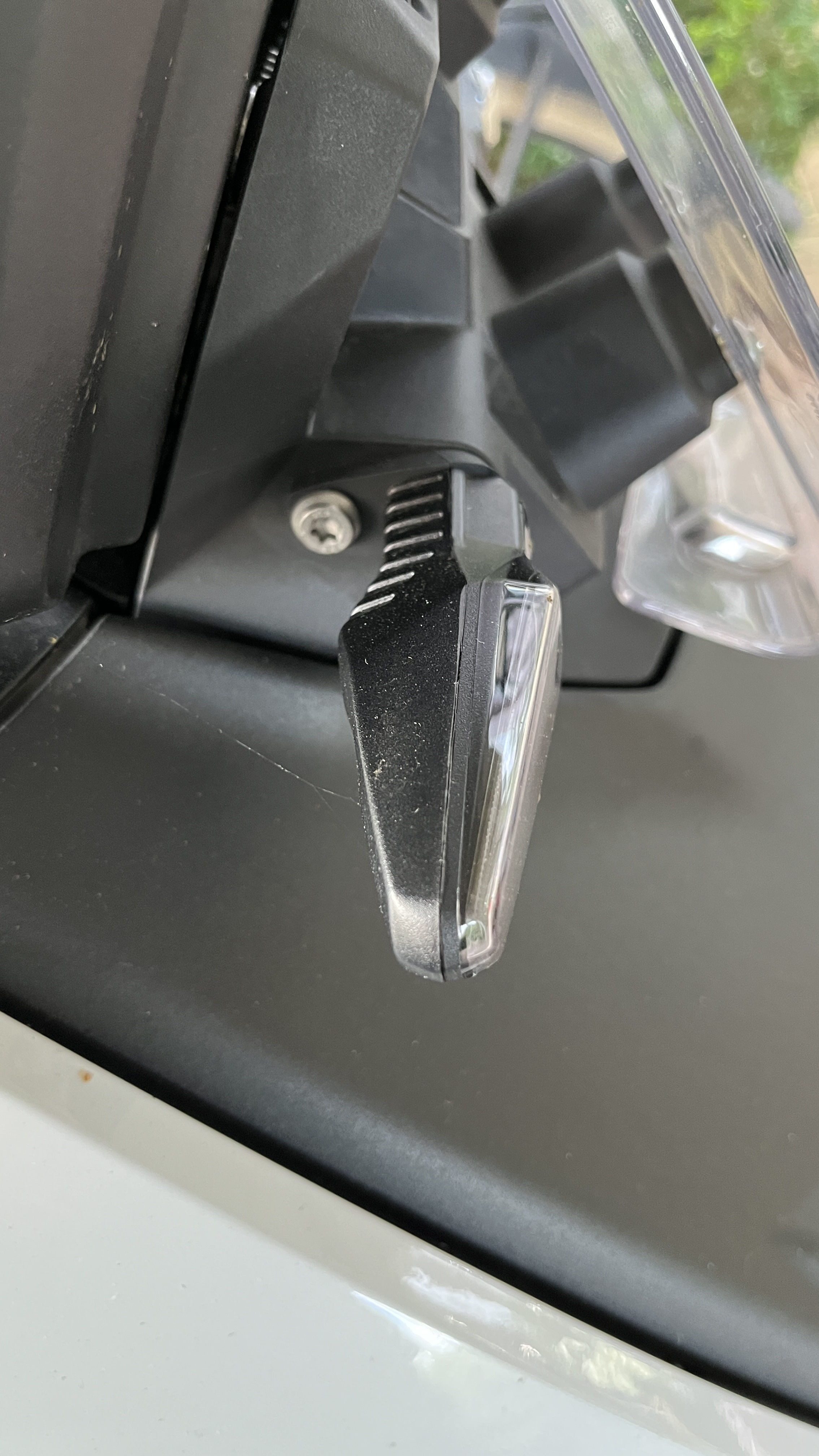 …jetzt bin ich mal gespannt, ob es einen findigen TÜV-Prüfer gibt, der das bemängelt… schließlich ist der Blinker ein abstehendes Teil und somit verletzungsträchtig - wenn das bei einer gewissen Aufprallstärke nicht bricht, könnte es letztendlich unangenehme Verletzungen verursachen.