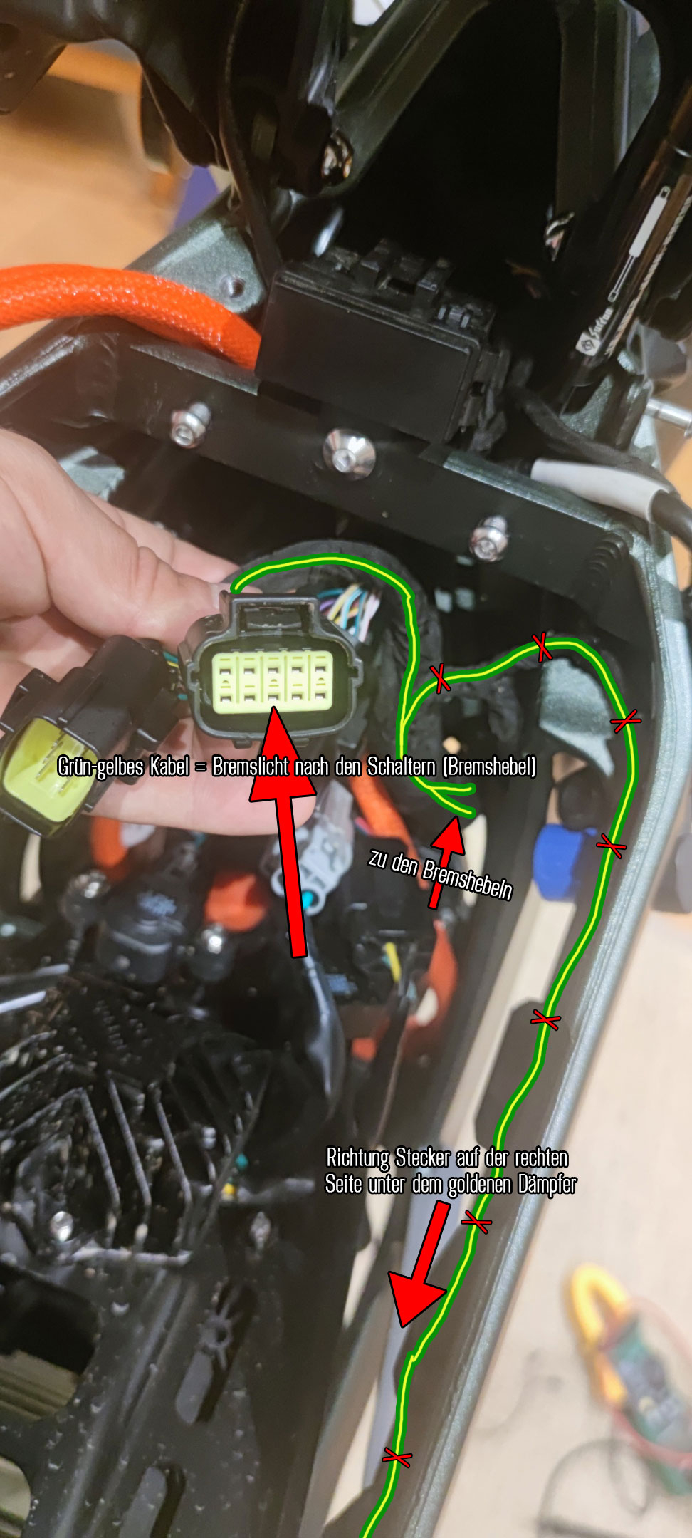 Falls jemand, wie ich, Probleme mit seinem Bremslicht hat und ich somit sowieso für Elmar von Elmox eine Zeichnung gemacht habe, teile ich diese hier, damit der nächste vielleicht nicht ganz so lange suchen muss, wie die Bremslicht-Verkabelung geführt ist: Es gehen vom EDC über 2 schwarze Kabel 12V-Dauerplus an die Bremshebel und dann mit dem grün-gelben Kabel wieder hinunter Richtung Stecker, den ich fotografiert habe. Irgendwo im Bereich wo der Kabelbaum sehr dick ist (vermute ich), werden die beiden grünen Kabel verbunden und danach als Brake Signal für die MCU zum großen Stecker am Bild und zusätzlich nach hinten zum Stecker unter dem goldenen Dämpfer geführt.