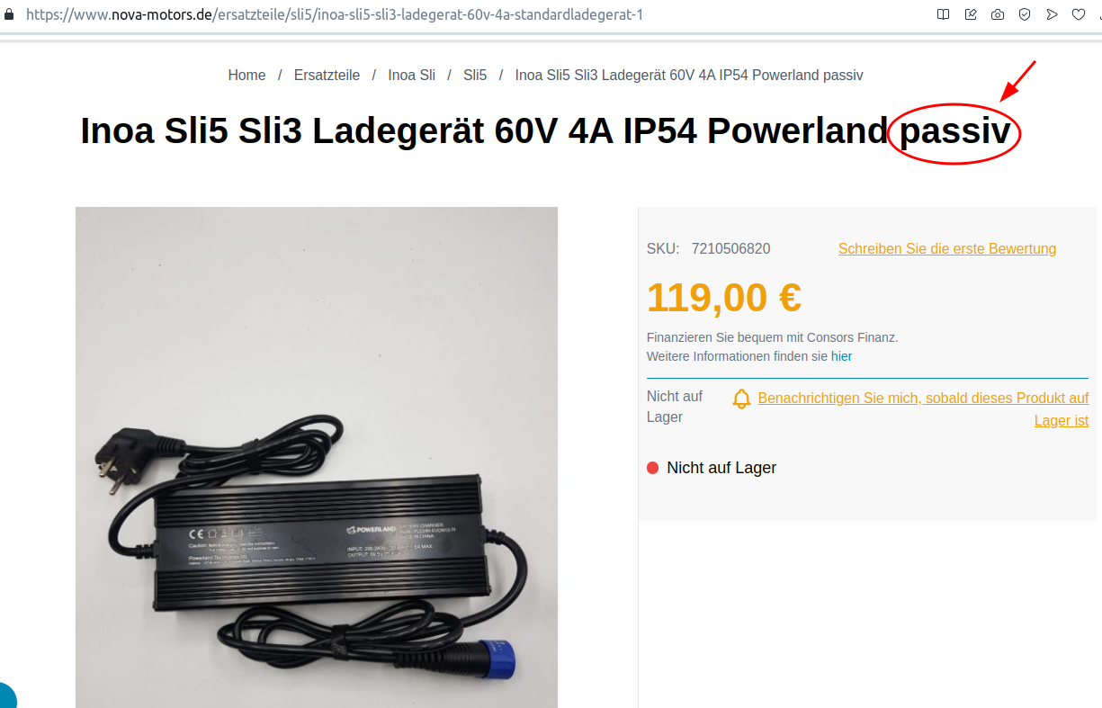 Bezüglich des Ladegeräts ist mir beim Durchsuchen des Nova-Motors Webstores aufgefallen, das diese einen zweiten Hersteller bei den Ladegeräten aufgenommen haben. Und zwar ist der neue Lieferant Powerland. Vorher war 's ja ausschliesslich Sans. Der 4 A-Lader von Sans wurde scheinbar schon länger nicht mehr produziert und ist bekanntlich seit einem Jahr nicht mehr lieferbar. Dem wurde hiermit abgeholfen.