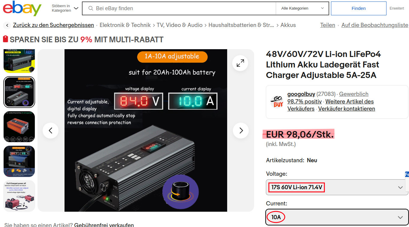 Hier gibt es noch eine 10A-Version von dem Ladegerät für nur 98 € incl. Versand: