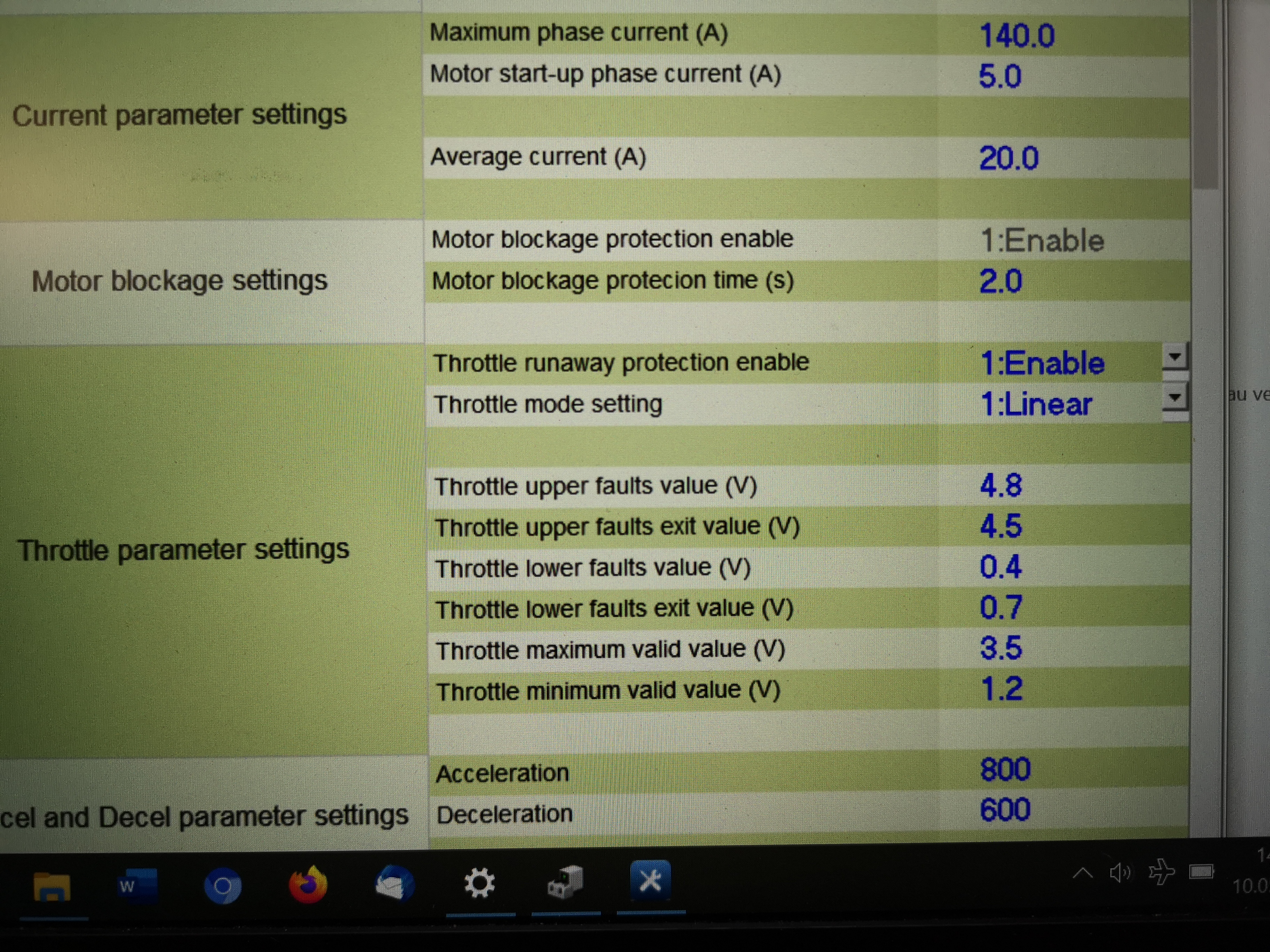 Da kann ich die untere und obere Einsatzschwelle des Stromdrehgriffs einstellen, die untere und obere Abschaltspannung und die Spannung, bei der nach Abschaltung wieder auf Funktion geschaltet wird. Das sieht z.B. so aus: