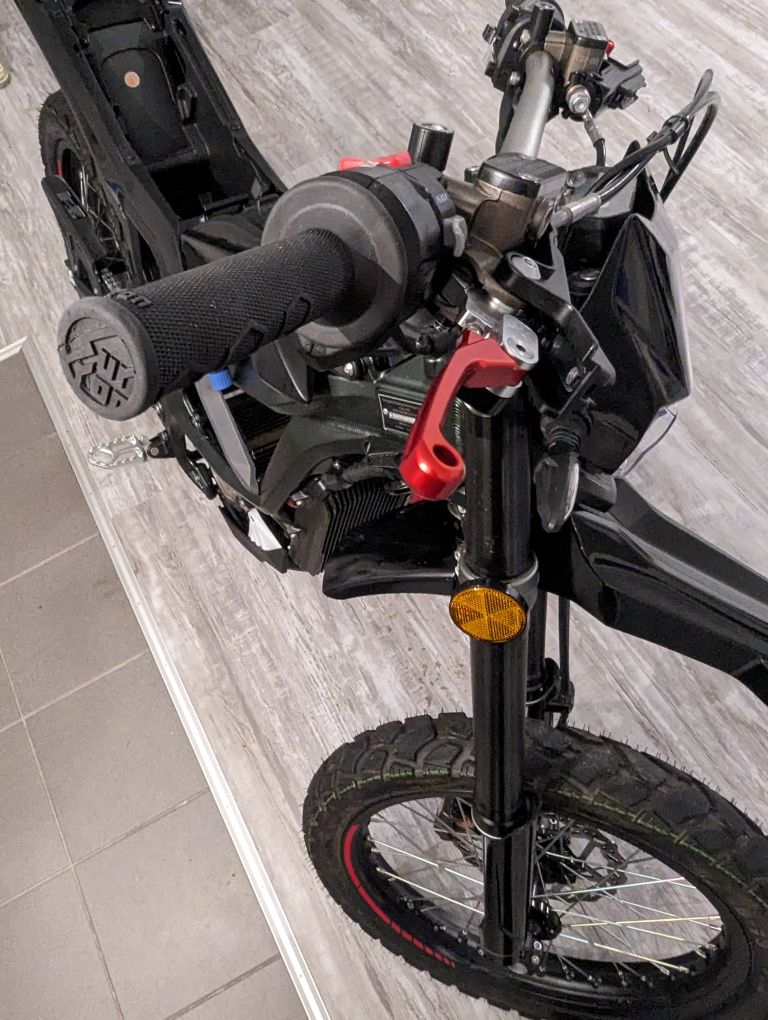 Die Surron ist jetzt schön schwarz mit roten Felgen-Streifen, doch beim zusammenbauen habe ich die Blinker falsch wieder eingebaut obwohl sie richtig von mir benannt wurde