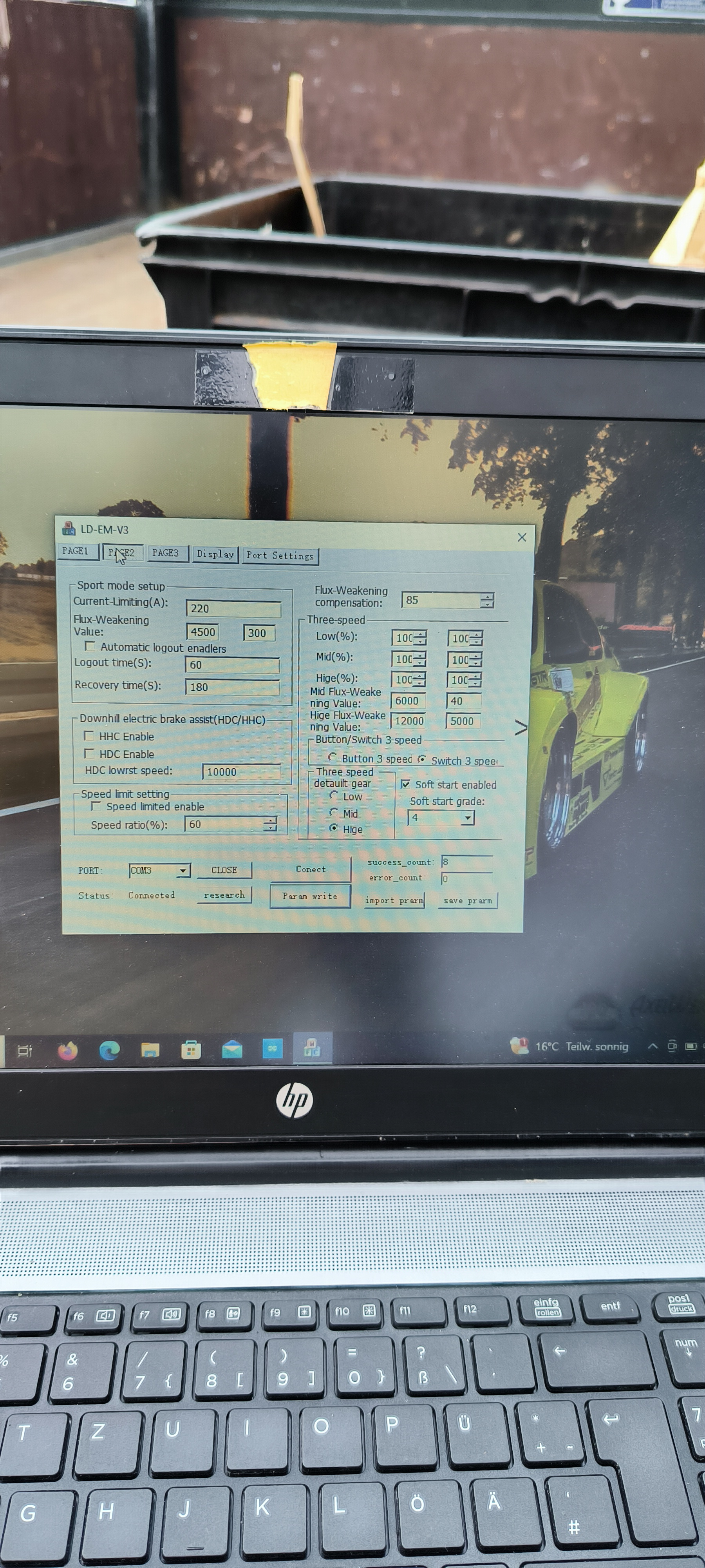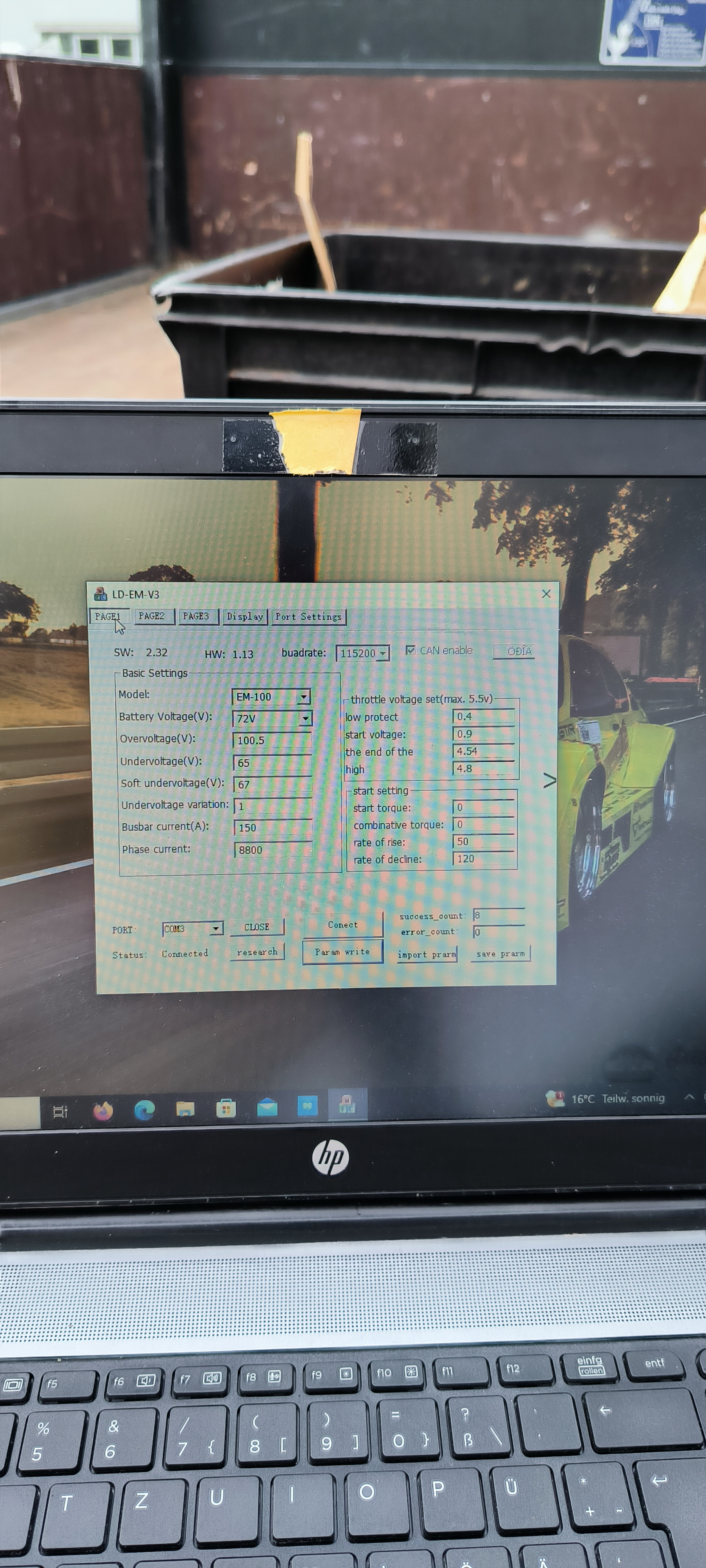 Versuch auch einmal die zu programmieren, ohne dass an den throttle-Leitungen etwas angeschlossen ist. Dann geht der Controller natürlich auch auf hall fault, weil ja kein Signal kommt, aber evtl. klappt dann das Abspeichern der Werte. Der hall fault geht m. E. immer an, wenn die throttle-Signalspannung beim Einschalten unter 0.4 Volt liegt (Erkennung -> kein Gasgriff dran) oder im Betrieb über 5.2 Volt erreicht. Werte oberhalb lassen sich auch nicht programmieren (vielleich verschluckt er sich auch daran). Ich kann bei mir (72 Volt am Controller) die untere Fehlerschwelle auf 0.3 Volt setzen und die obere auf 4.95 Volt (kann sein, dass auch mal zwei Stellen hinter dem Punkt notwendig sind, damit er das schluckt).