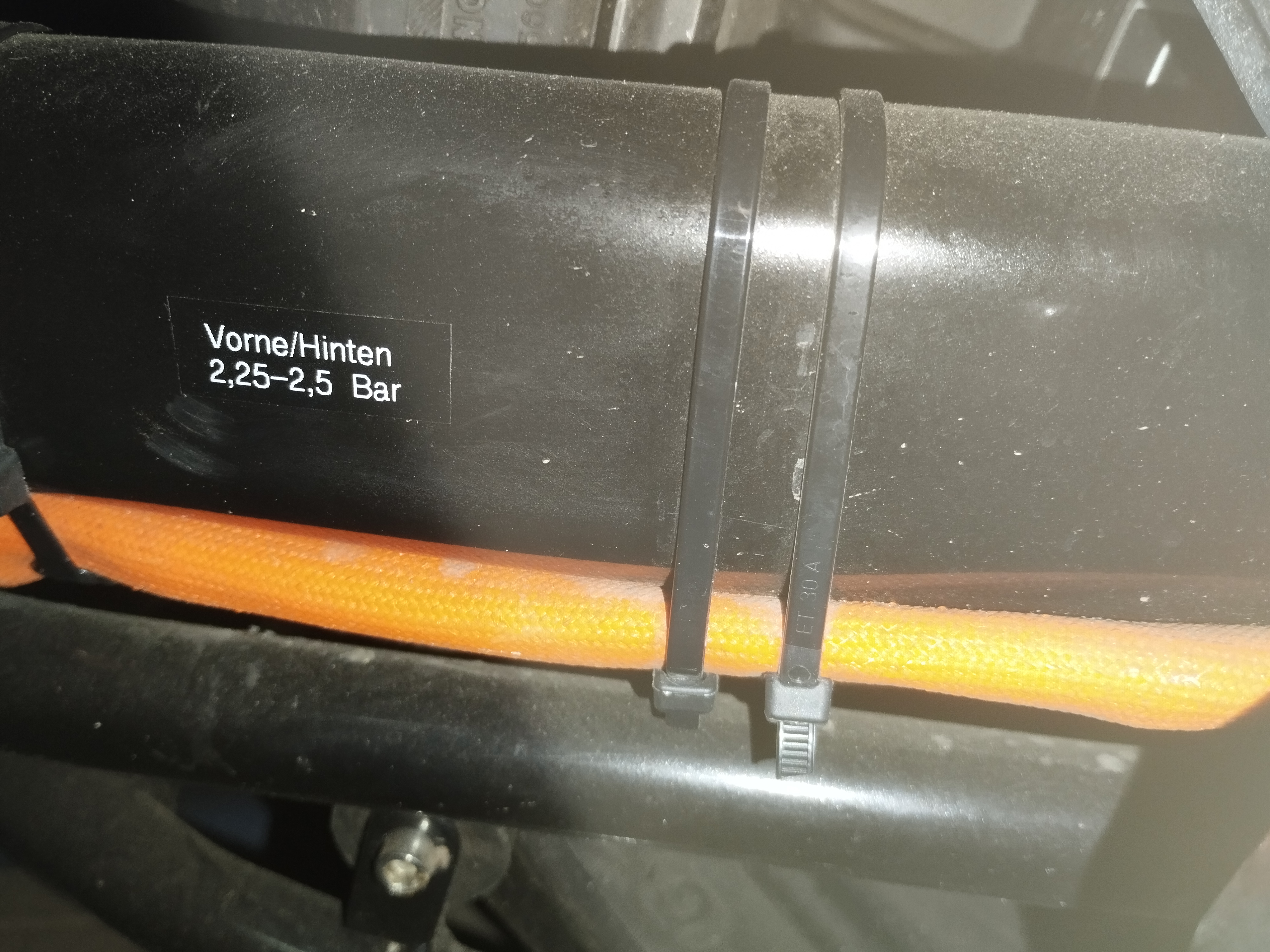 Hi, ich kann dir gerade nicht mit einem Bild vom Original Aufkleber dienen, ich habe mir hinten auf die Schwinge einen gedruckten Aufkleber geklebt. Bild anbei, vorne fahre ich eher mit um die 2,25Bar hinten mit um die 2,5Bar.BRB hat geschrieben: ↑Di 23. Jul 2024, 20:07Hallo zusammen, sorry dass ich so reinplatze, aber ich habe ein Problem.