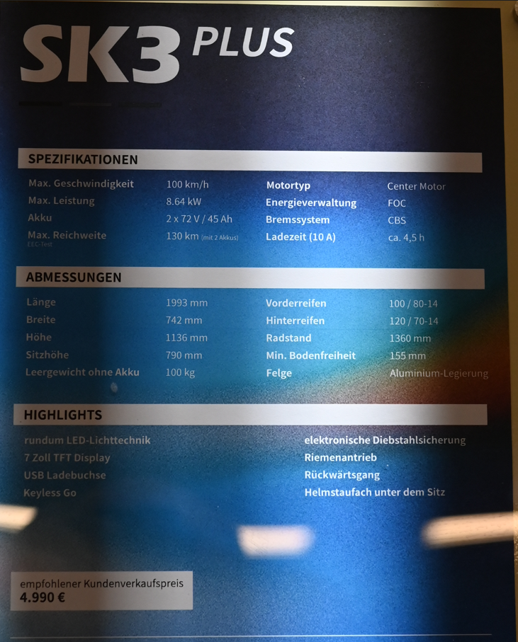 bei den Fahrzeugen auf der Messe hatte der EK3 Plus den erkennbaren ABS-Ring: und auf dem Datenblatt stand das ABS auch mit drauf: Im Datenblatt des SK3 Plus fehlte der Eintrag ABS und es war auch kein Ring an der Bremsscheibe zu sehen. Über den SEMENTI gab es hier im Forum vor länger Zeit eine Diskussion und dann war es lange ruhig. Jetzt scheint es damit aber ernst zu werden.