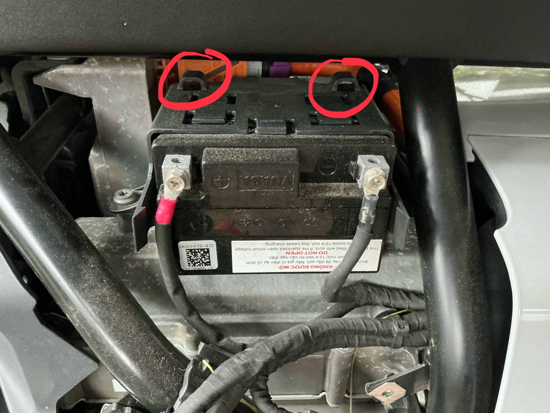 Die Abdeckung der Starterbatterie sitzt vorne nur lose und wird hinten in die beiden Befestigungen eingeschoben. Gehalten wird die Abdeckung nur durch das vordere weiße Seitenteil.