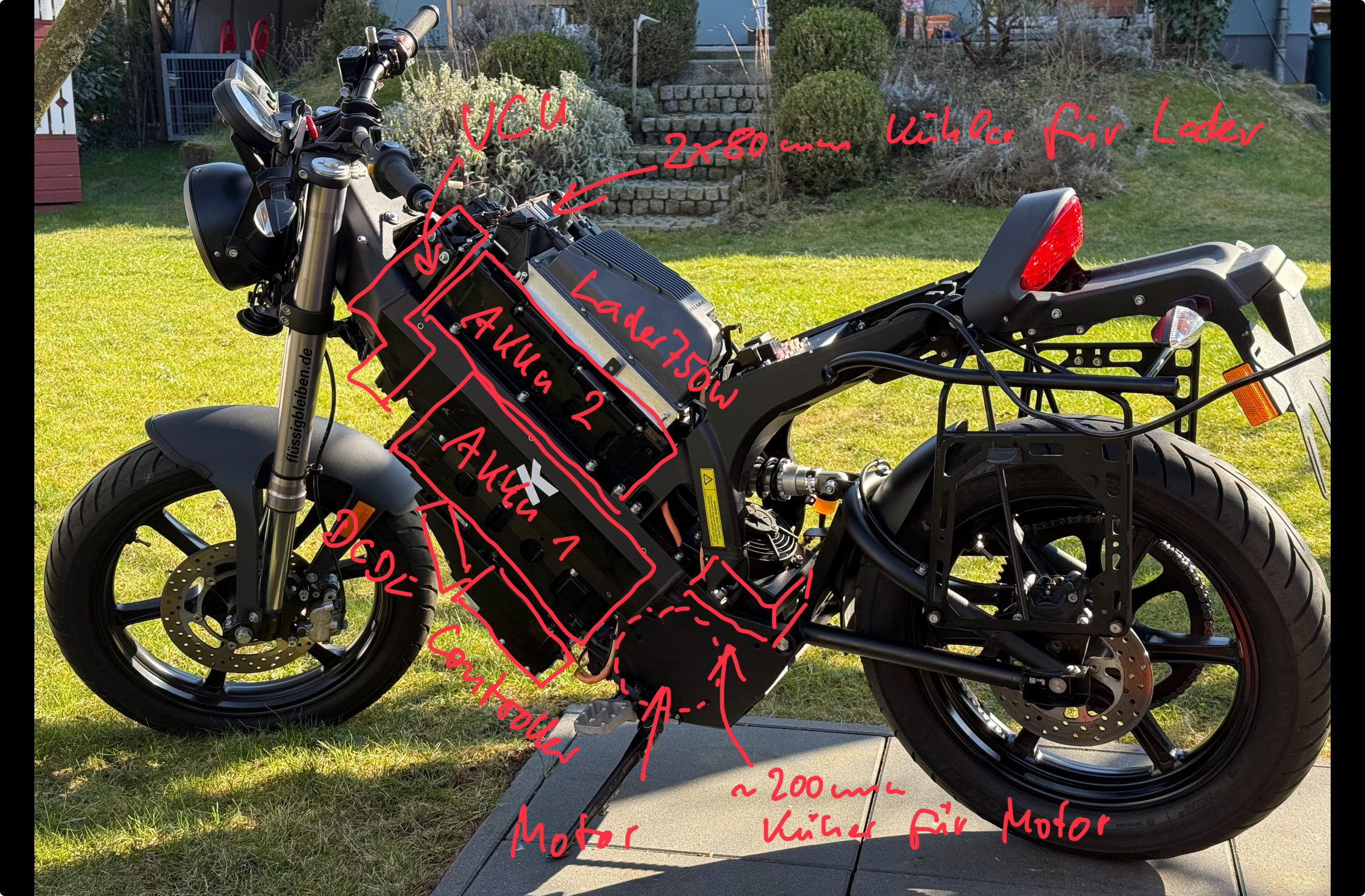 Da das interne Ladegerät aber von der VCU gesteuert wird und sich die Diagnosesignale von beiden BMS berücksichtigt, habe ich hier mehr Vertrauen, dass eine ordentliches Balancieren stattfindet. Zudem liegt meine Motivation darin, dass Bike im Originalzustand wieder herzustellen, eine Bastellösung wäre immer nur ein Kompromiss. Die Größe sieht man ja nicht unter der Verkleidung.