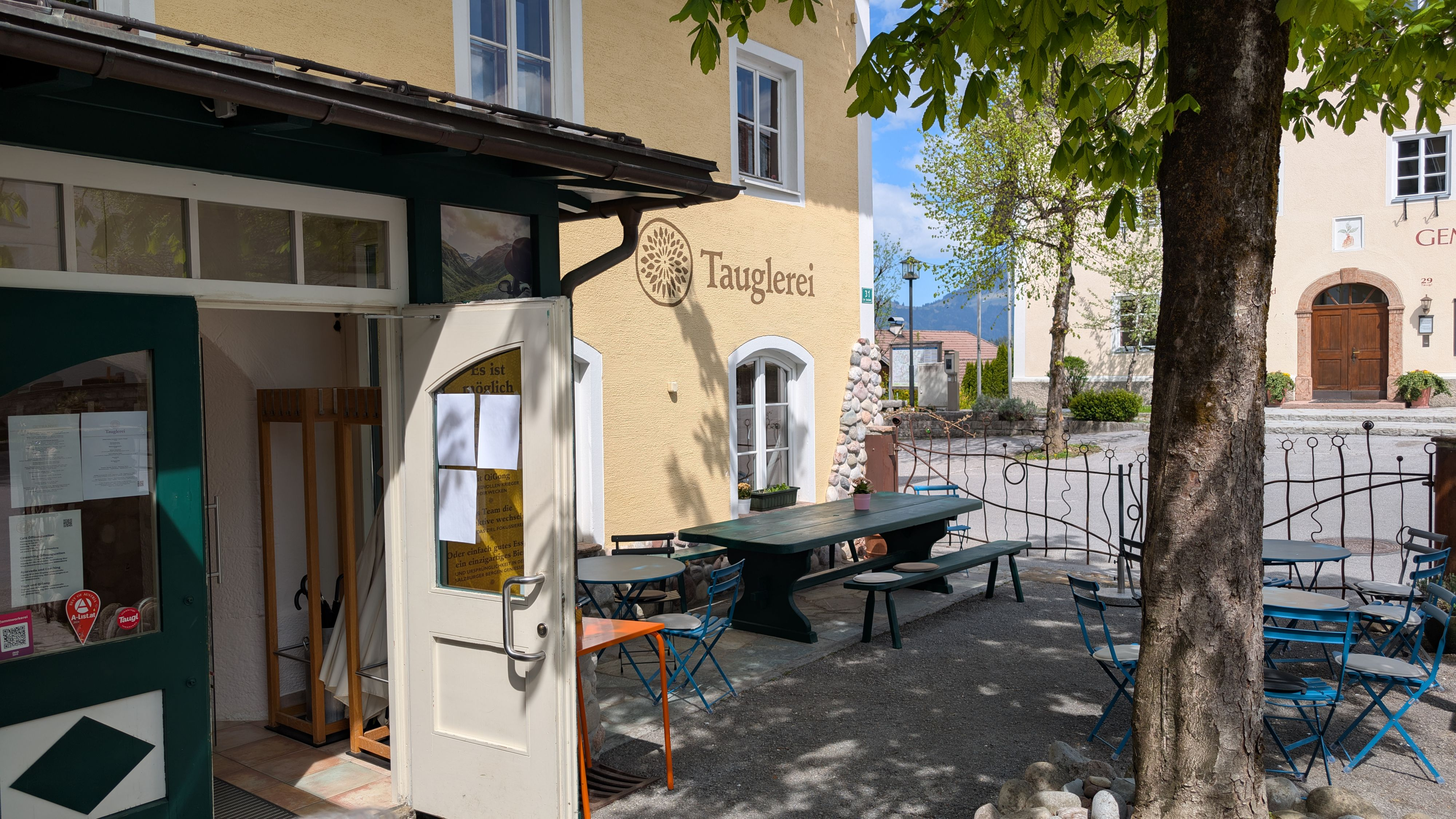 Fängt schon mal grandios an mit der Entdeckung einer Premium-Ladesäule direkt am Hintereingang des lauschigen Wirt z'Amerang. Anstecken und durch kleine Holztür in alter Mauer direkt in den Gastgarten. Die Säule funzt, bietet den SWM 49Ct Tarif und hat einen perfekt motorradgeeigneten Parkplatz. Neuer Lade-POI in meiner Sammlung.