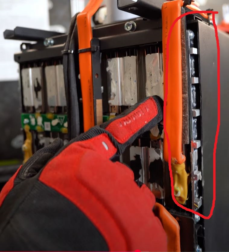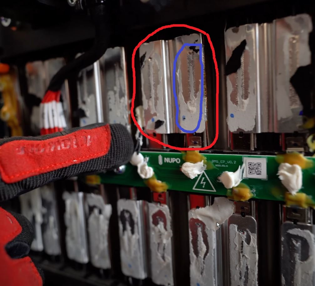 Die Zellen scheinen mit dem Busbars verschweißt zu sein, was die Reparatur (Zellentausch) des Akkus sehr schwer macht oder sogar unmöglich.