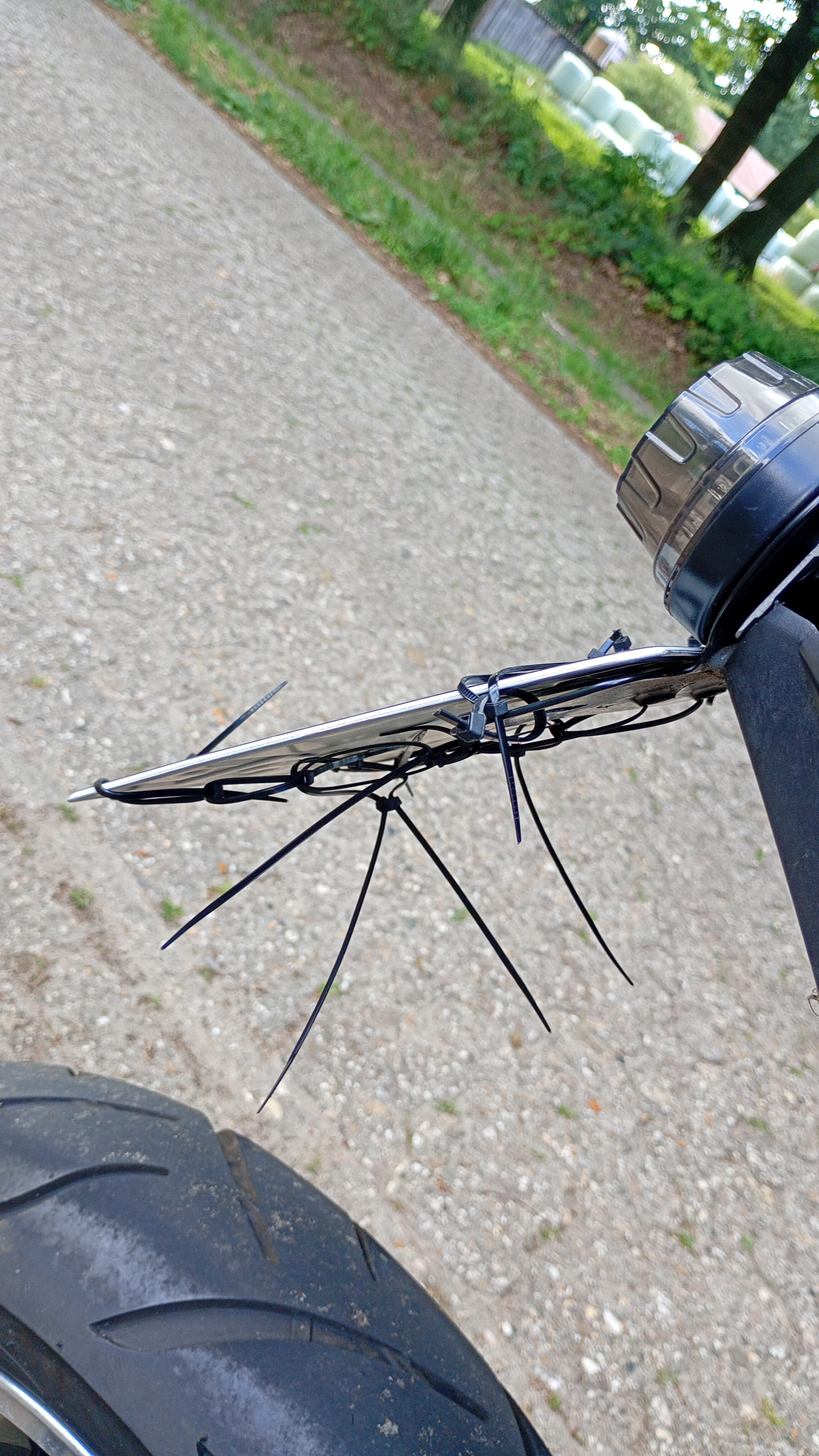 Rest bezahlt, Ladegerät eingepackt, Kennzeichen mit Kabelbinder montiert, Motorradkleidung angezogen und noch die Gear360 am Spiegel befestigt.