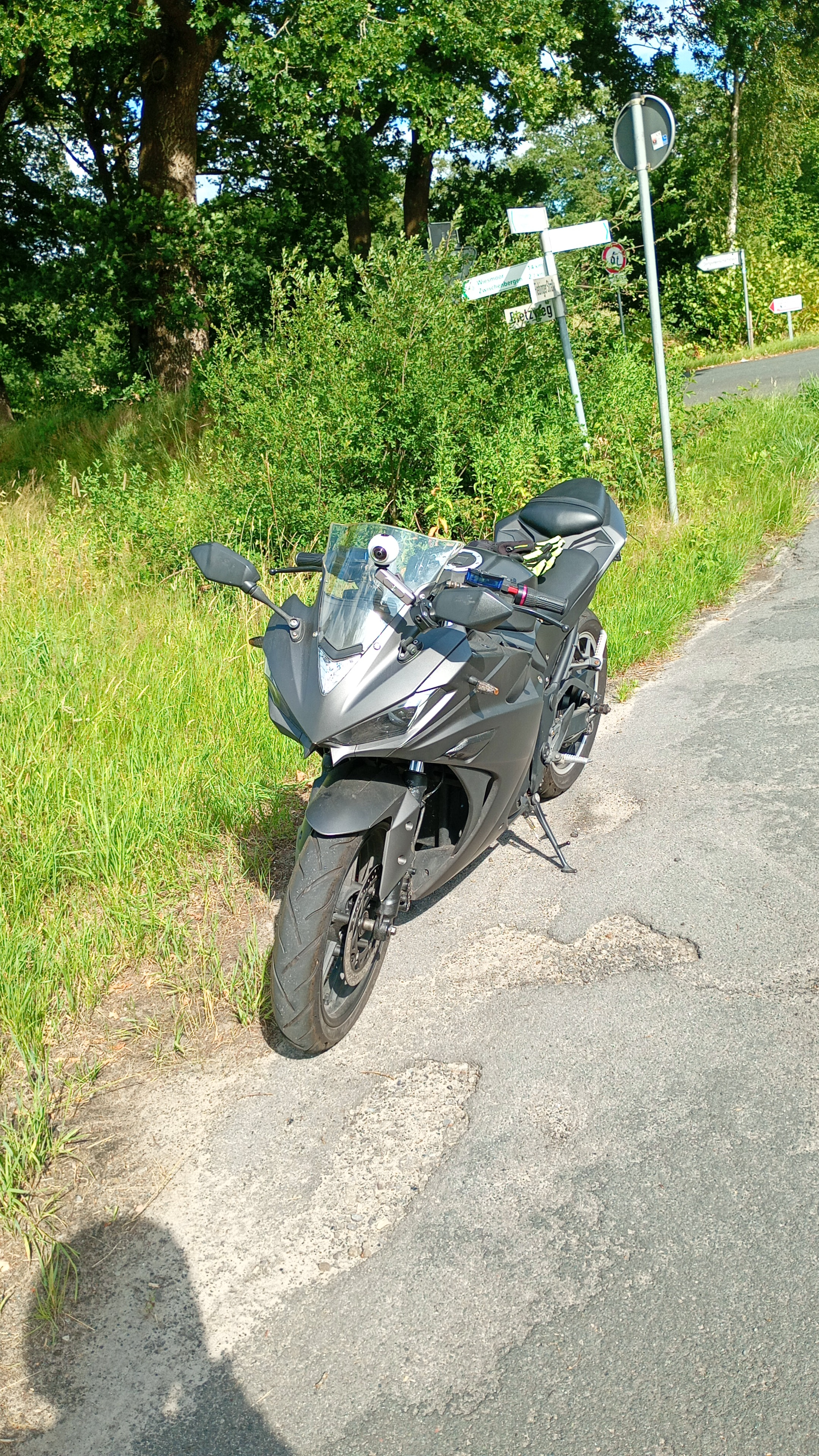 Rest bezahlt, Ladegerät eingepackt, Kennzeichen mit Kabelbinder montiert, Motorradkleidung angezogen und noch die Gear360 am Spiegel befestigt.