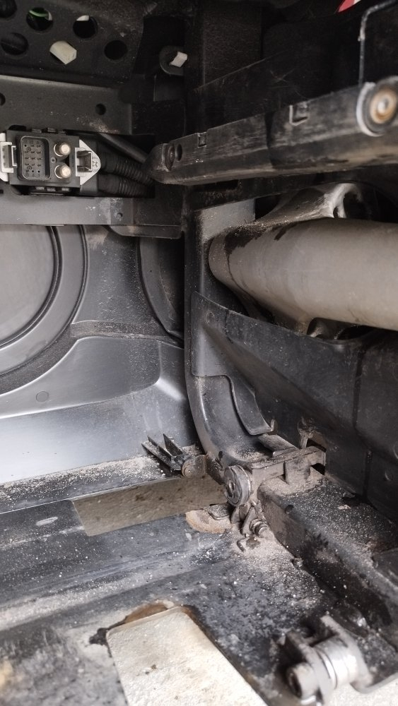 Für die obere M6-Schraube (die lange) musste ich den Haltebügel vom Akkufach her deutlich nach oben biegen und den Winkel des letzten Teiles mit der angeschweißten Mutter ändern, damit ich die Schraube hineinbekommen habe. MIt dem ersten Anbauversuch war das ca 1 cm zu niedrig. Die originale Spritzschutzplatte kommt da gut mit, der Spalt zur Sitzbankwanne ist jetzt deutlich kleiner als vorher. Man sollte nur darauf achten, dass die rechte obere Ecke nicht den Bremsschlauch einklemmt, sondern besser auf der Gummimanschette desselben aufliegt. (Habe leider noch kein Foto, erklärt sich aber von selbst).