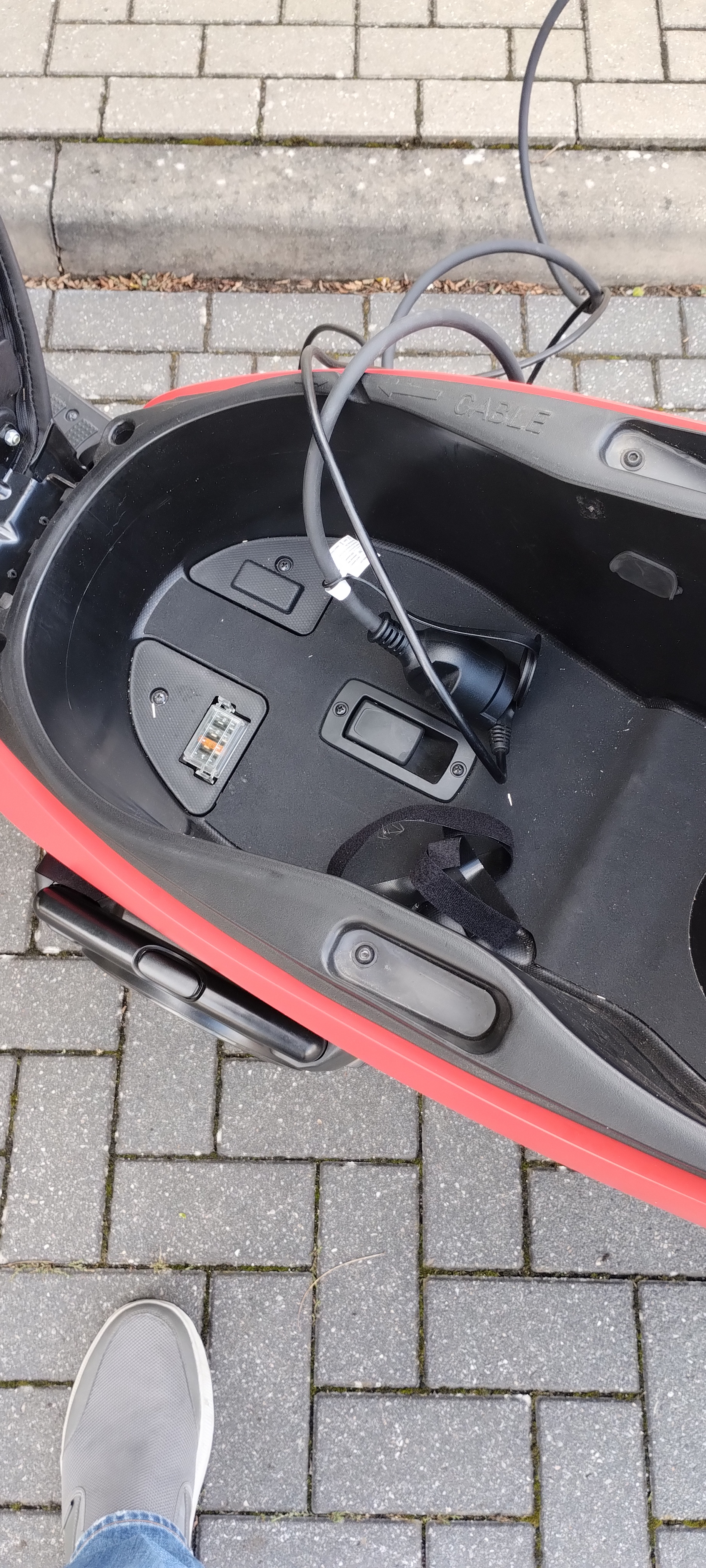 Für mich ist es egal, wo der Lader liegt --solange trocken .. ich habe nicht vor die Batterie während des Fahrens aus dem Roller zu entnehmen.