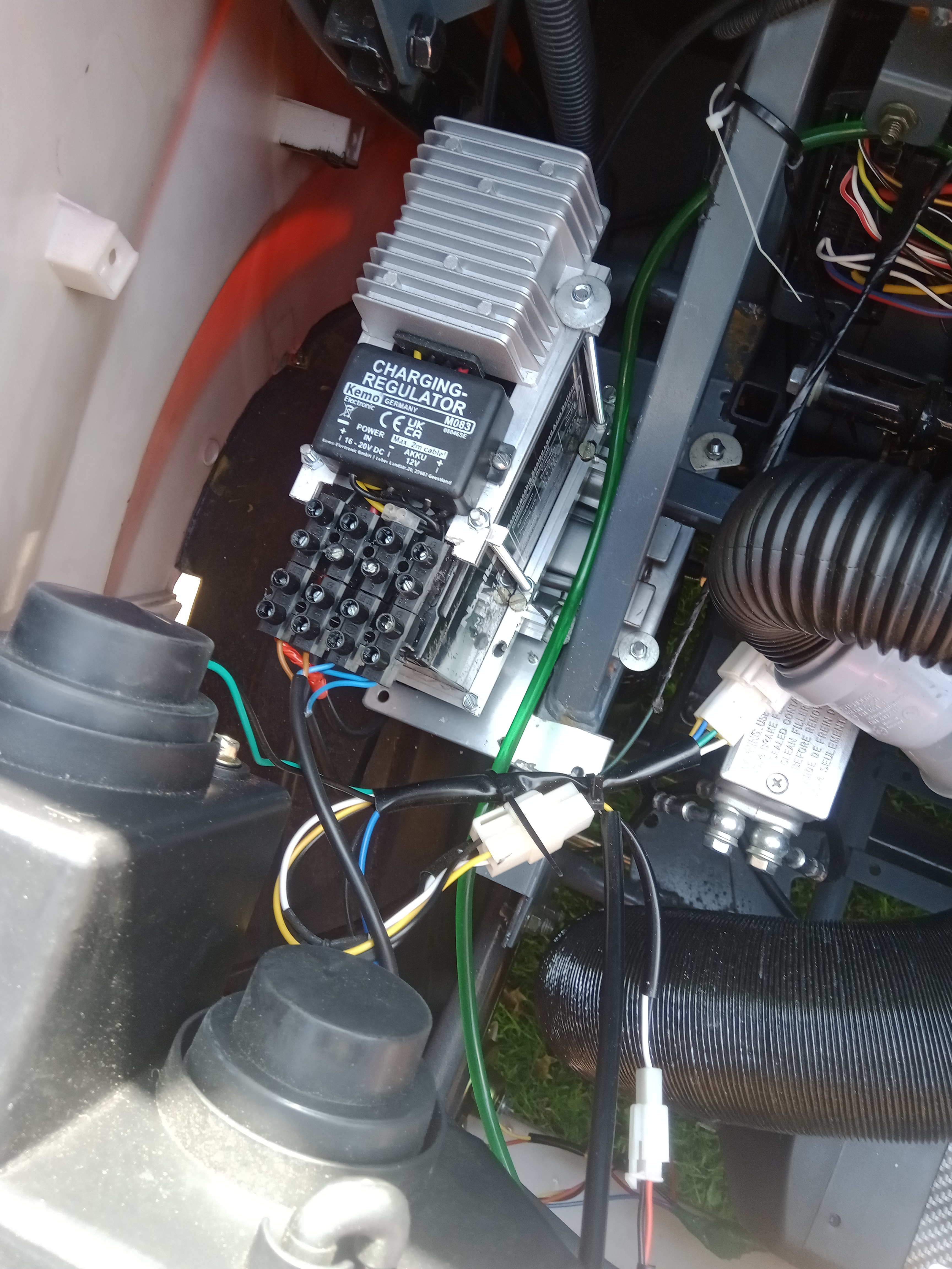 Nebenbei den sinnlosen "So-da"knopf durch eine 12 V Buchse ersetzt.Kann man immer gebrauchen für alle möglichen Zubehöre....wie z.B. eine Sitzheizung unterm Bezug im Winter.Läuft ja dann über den kleinen Akku ;) .Der soll von dort aus auch über das Solarpaneel geladen werden,falls es nicht reicht zusätzlich über die Fahrakkus.