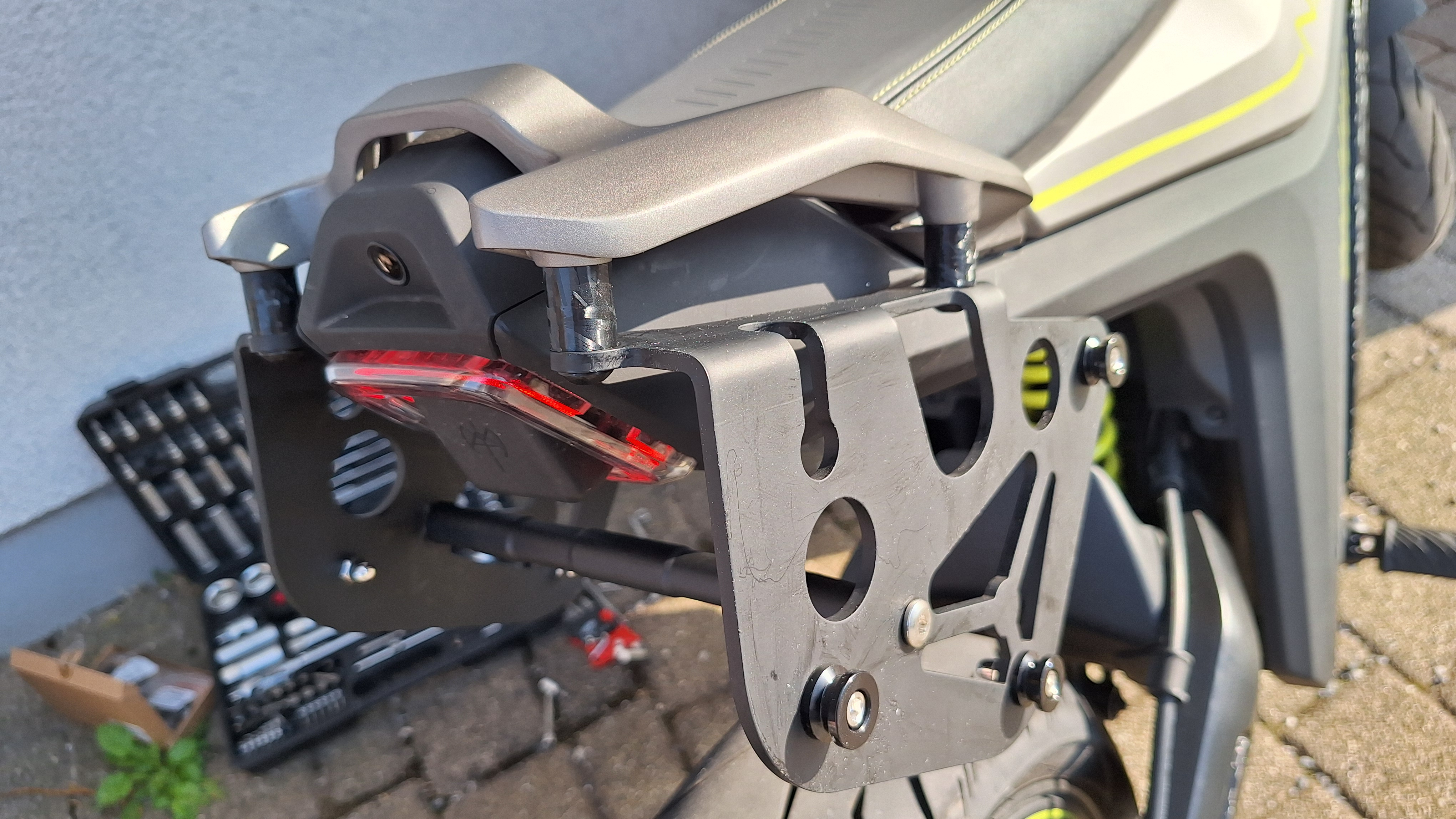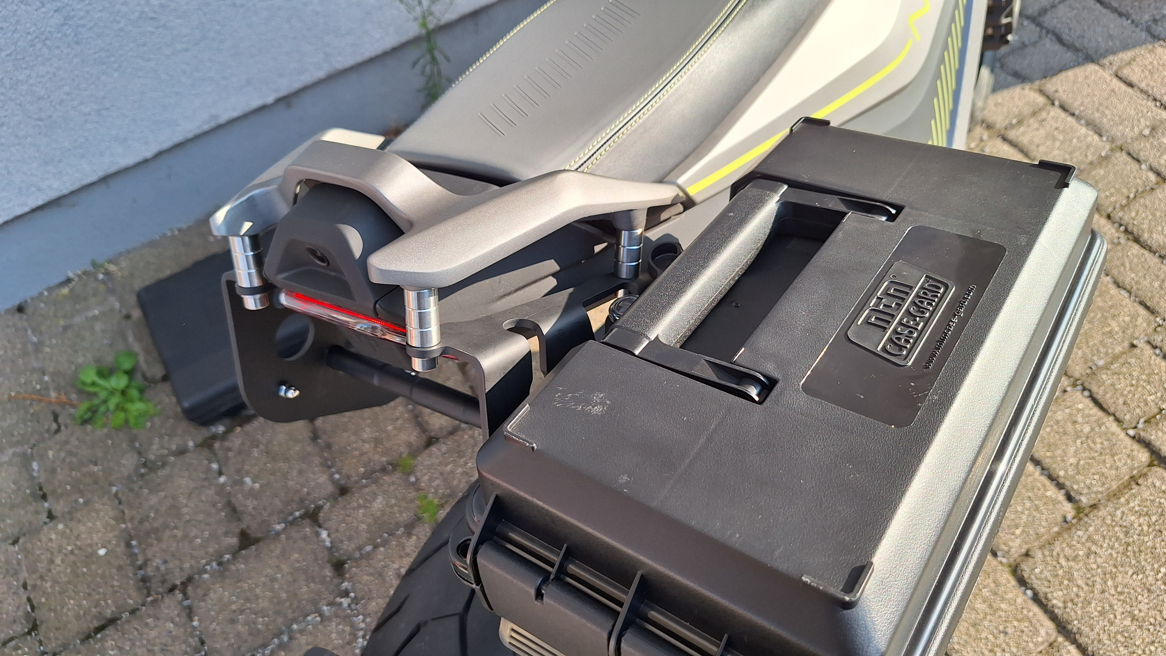 Die Breite der montierten Koffer ist ca. 65 cm. Das passt noch so von der Größe zum Bike und wirkt nicht übertrieben. Und Stauraum hab ich jetzt auch genug.