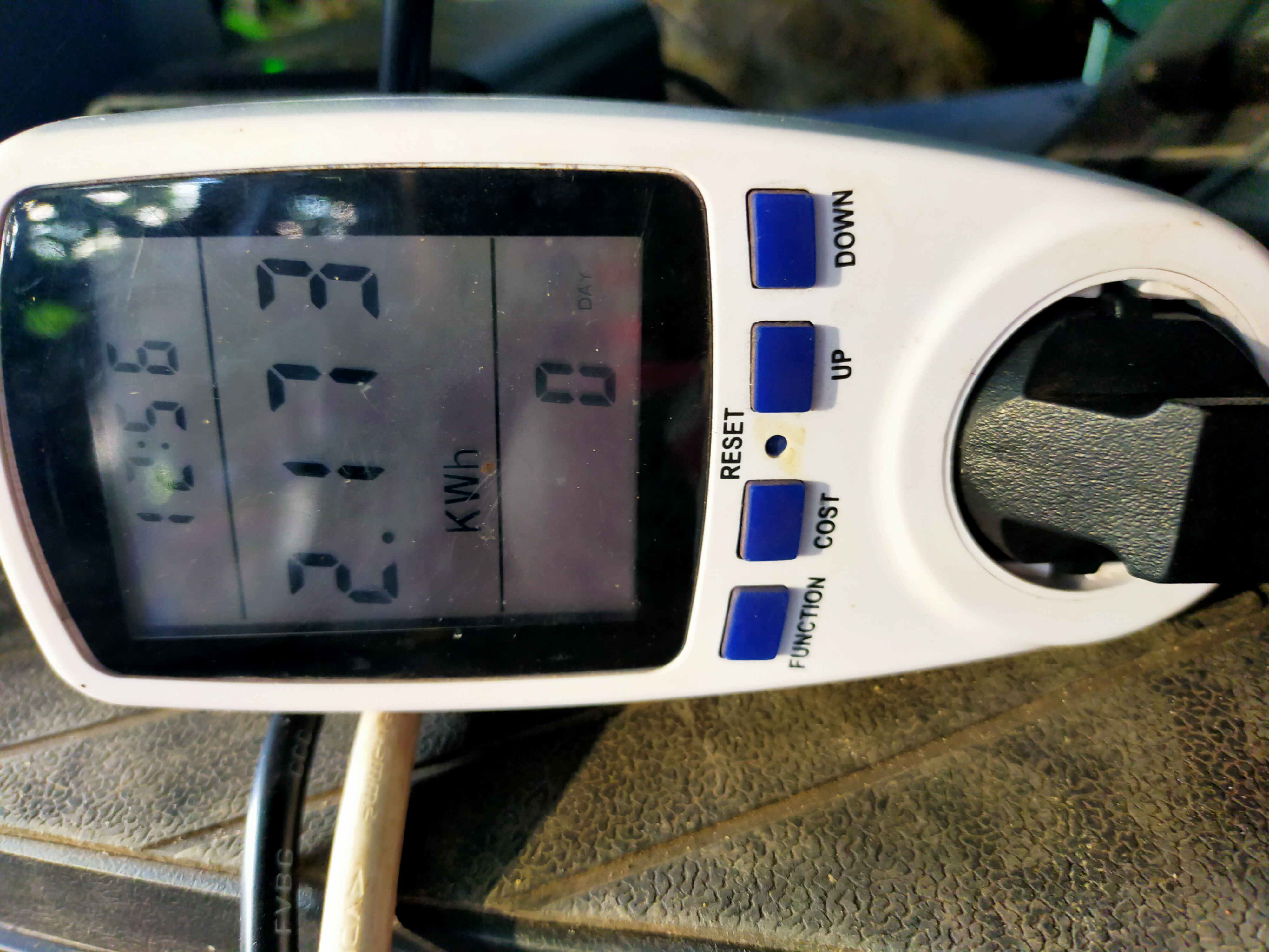 2,173 kWh ab Steckdose nachgeladen in den 30 Ah nmc Akku der laut Falcon Display COC 0% hatte und der Kontroller den Motor nicht mehr mit Strom versorgt hat. Das originale Ladegerät ließ ich über Nacht 12 Stunden und 56 Minuten angeschlossen und obwohl es grün anzeigt findet immer noch ein Leistungsbezug aus der 230 V Steckdose von 7,8 W statt.