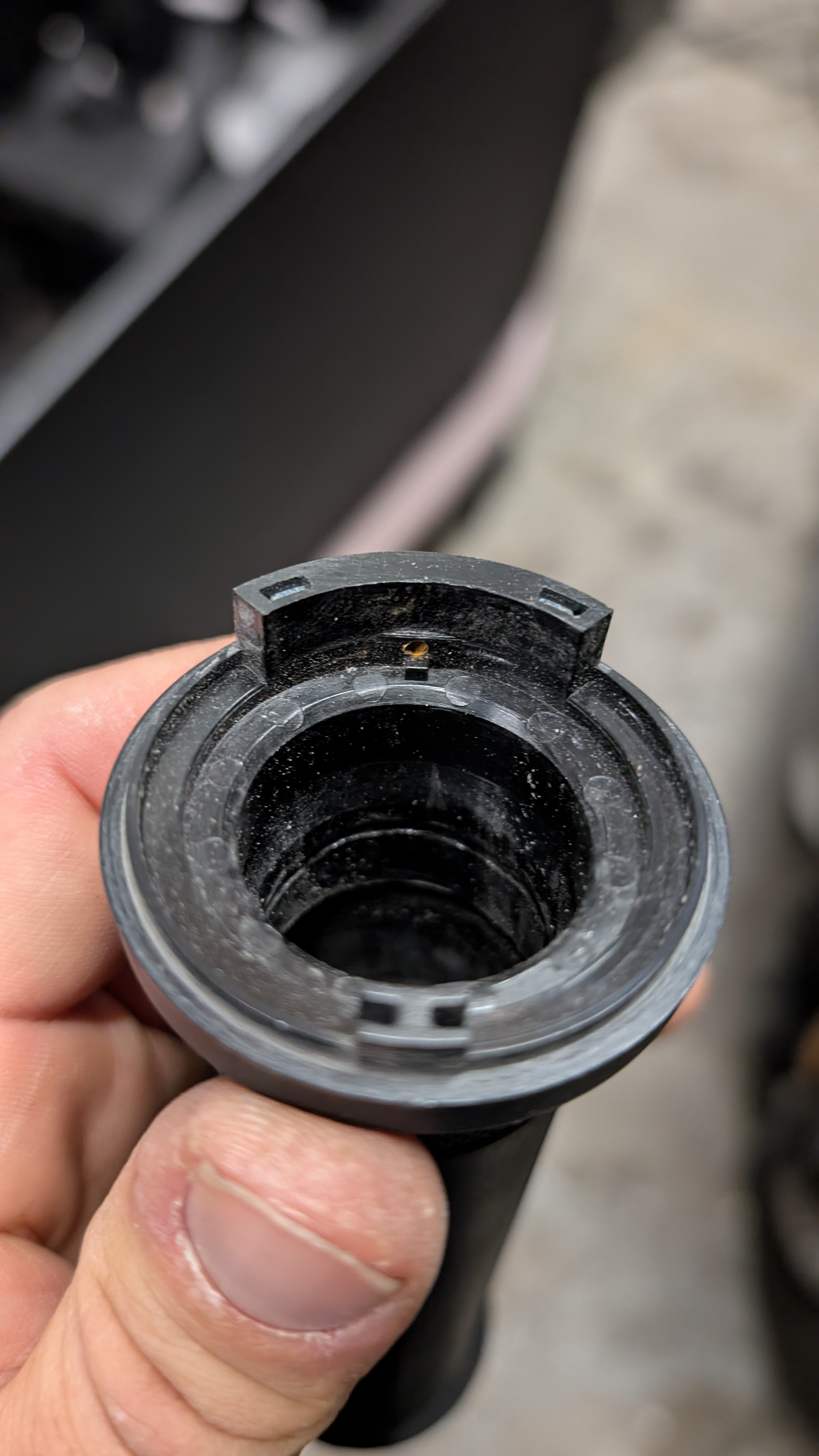 Ich habe gerade meinen zweiten Gasgriff ersetzt. In beiden Fällen war die Feder in Ordnung, aber der Motor gab weiterhin Leistung, auch wenn der Gashebel geschlossen war. Das Fahren über eine Unebenheit konnte die Leistung plötzlich erhöhen. Jetzt ist der Scooter aus der Garantie, also habe ich beschlossen, einen Blick hineinzuwerfen. In meinem Fall ist die Ursache ein gebrochenes Stück Plastik, das den Hall-Effekt-Magneten hält. Der Magnet kann dann verrutschen, was dazu führt, dass der Sensor eine falsche Gasposition liest. Wahrscheinlich wird das Plastik während des Herstellungsprozesses geschwächt, wenn der Magnet hineingedrückt wird. Während des normalen Betriebs dient das geschwächte Plastik auch als Anschlag, wenn der Gashebel auf 100% geöffnet wird. Irgendwann bricht es.