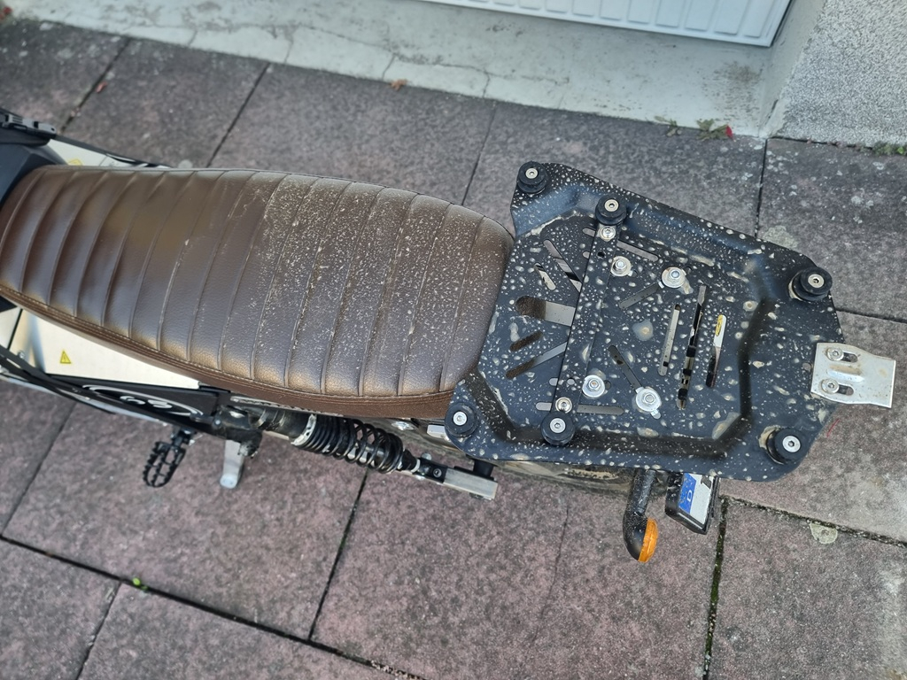 Da kann man bestimmt auch schönere Befestigungspunkte statt den Fussrasten finden, aber hier passte das ohne Bastelei.