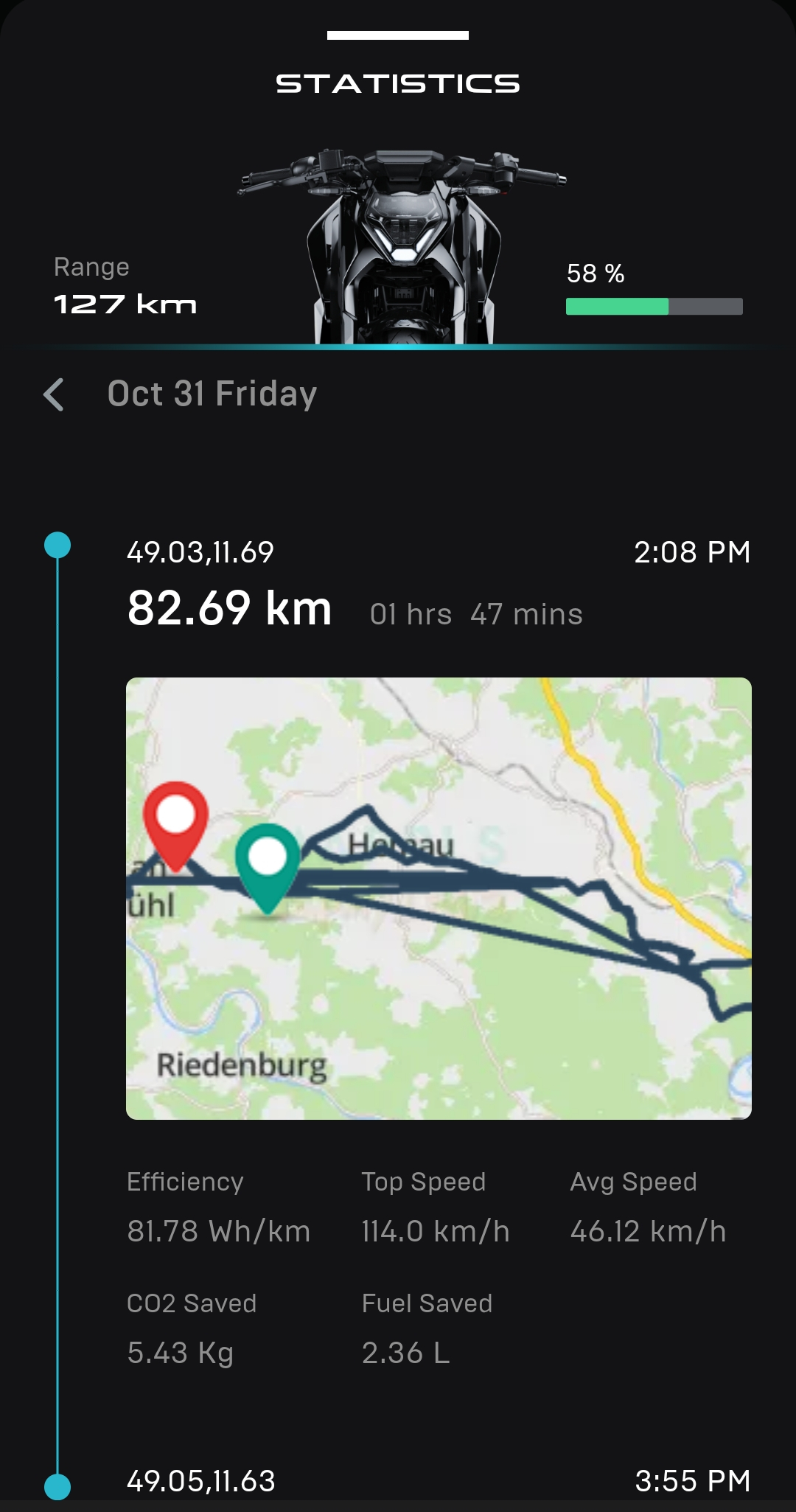Das kommt dabei raus, wenn man etwas Spaß haben möchte ~ 80 Wh/km. Die Strecke war aber typisch für meine Gegend mit vielen Höhenmetern. Genaugenommen waren es kumulierend ~1600m rauf und der gleiche Wert runter.