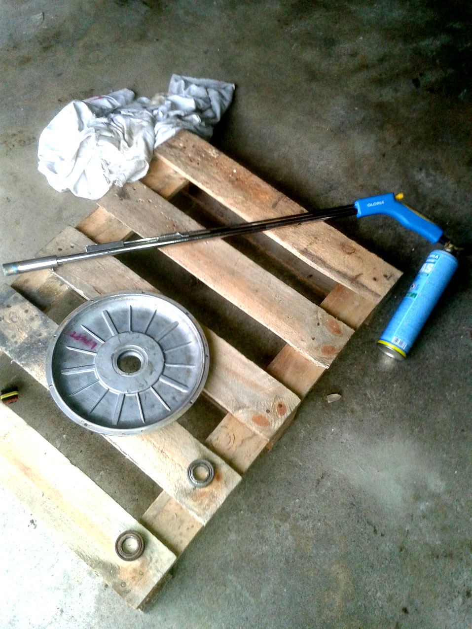 Defekte Lager (47X25X12 mm) mit geeignetem Werkzeug austreiben. Vorher mit Lötbrenner Umgebung der Lager erwärmen ( Lötbrenner)