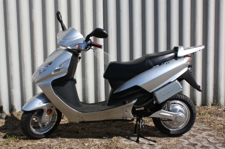 Einen äußerlich baugleichen habe ich schon 2008 probegefahren. 43 Km/h laut GPS, so wie die meisten 45 Km/h-E-Roller. Die meisten Benzinroller sind serienmäßig etwas schneller. Sehr großer Roller, ideal für Großgewachsene, ähnlich groß wie Solar Scooter Sport. Die Gewichtsverteilung war angenehm. Ein Akku unterm Fahrersitz, darunter nochmals 2 Akkus (oder umgekehrt). Der vierte war jedenfalls hinterm Helmfach auf Höhe des Rücklichts versteckt. Dort, wo bei der Benzinversion der Tank ist. Die chinesische Benzinversion ist direkt, bis in die kleinsten Details (nur der Motor ist einfacher, 2 Ventile statt 4, kein Ölkühler), von einem koreanischen Original abgekupfert: Daelim Otello.
