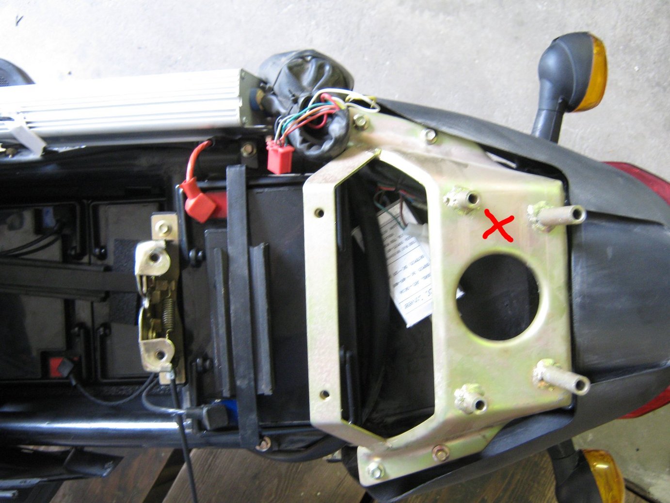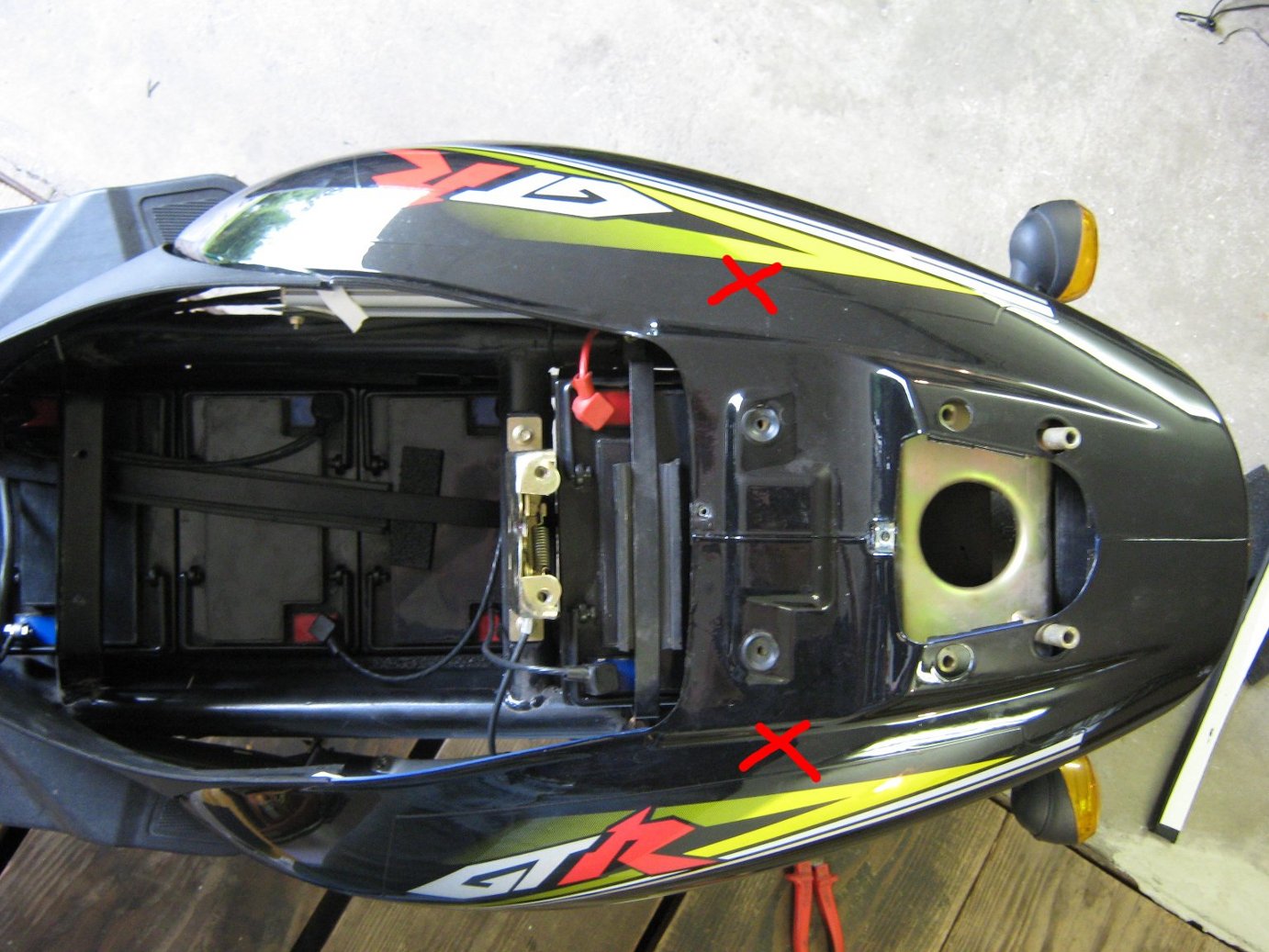 Der Sitz wird hochgeklappt, anschließend die 4 markierten Sechskantschrauben (8 mm) entfernt und das Helmfach herausgehoben. Dieser Schritt ist schon ausreichend, wenn man nur die Batterien prüfen will.