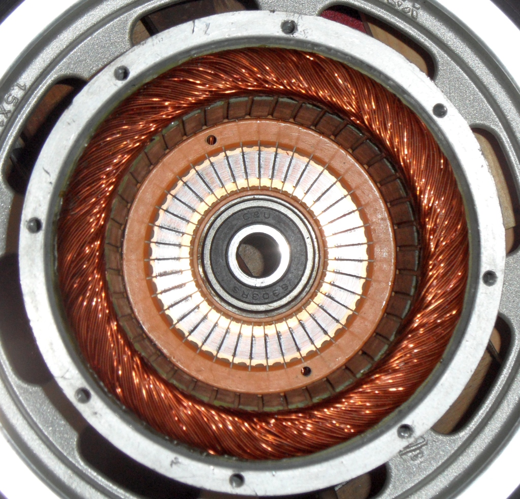 Das Schadensbild auf der Bürstenseite finde ich rätselhaft. Vier gegenüberliegende Bürsten sind noch in Ordnung und etwa zu 50 % abgenutzt. Die restlichen dazwischen - abgeschmolzen. Auffällig ist eine Stelle in der Wicklung, die durch eine Öffnung im Nabendeckel erreichbar ist. Es sieht so aus, als ob mit einem Splintentreiber und Hammerschlag von aussen durch die 4 mm Öffnung die Wicklung durchtrennt worden ist. :o
