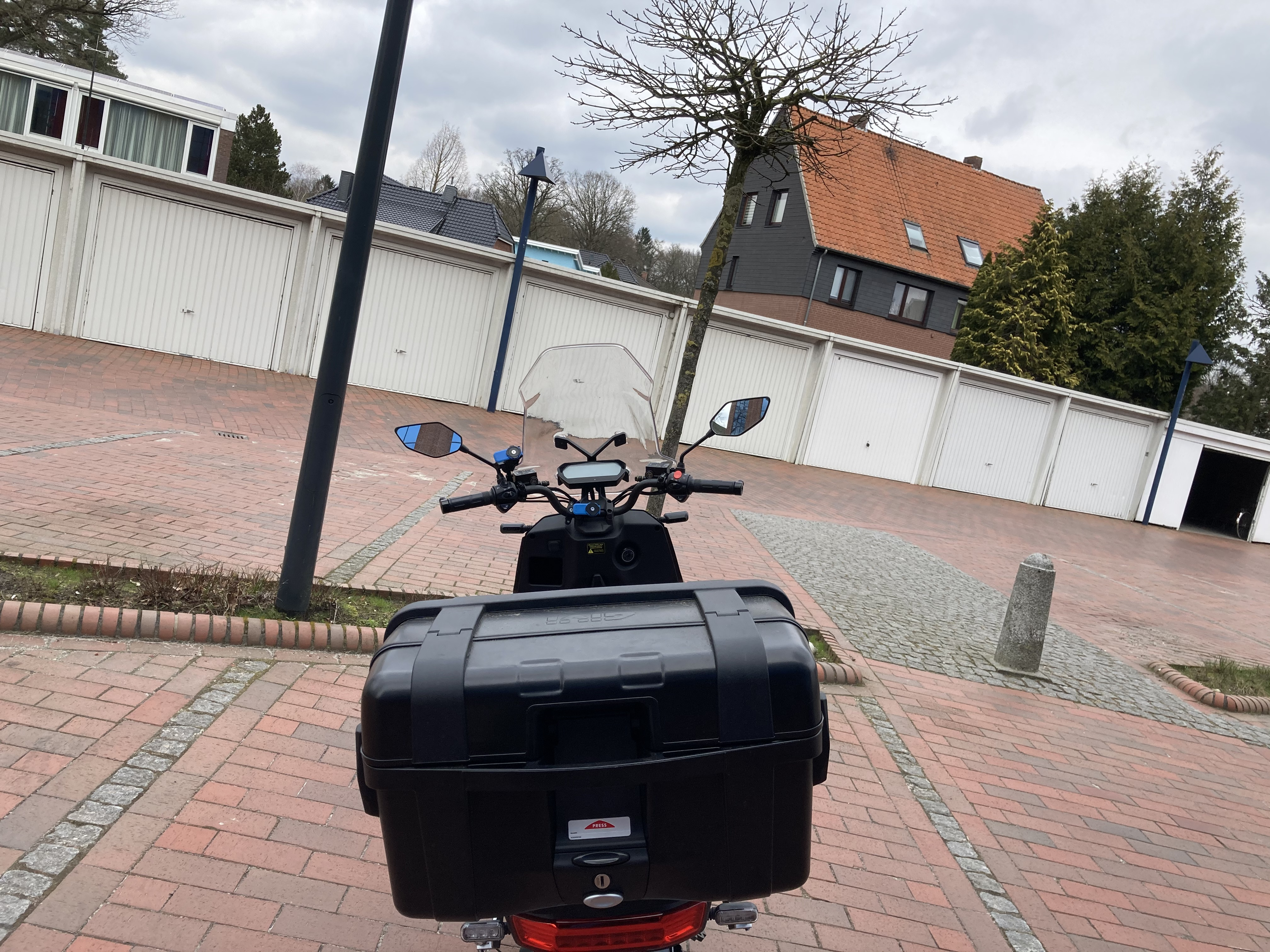 Über den Winter habe ich die ersten knapp 1.000 km zusammengestromert. Und habe mittlerweile ein Topcase installiert. Das ist ein Givi Trekker 46L. Meiner Meinung nach passt er optisch sehr gut zum CPX.