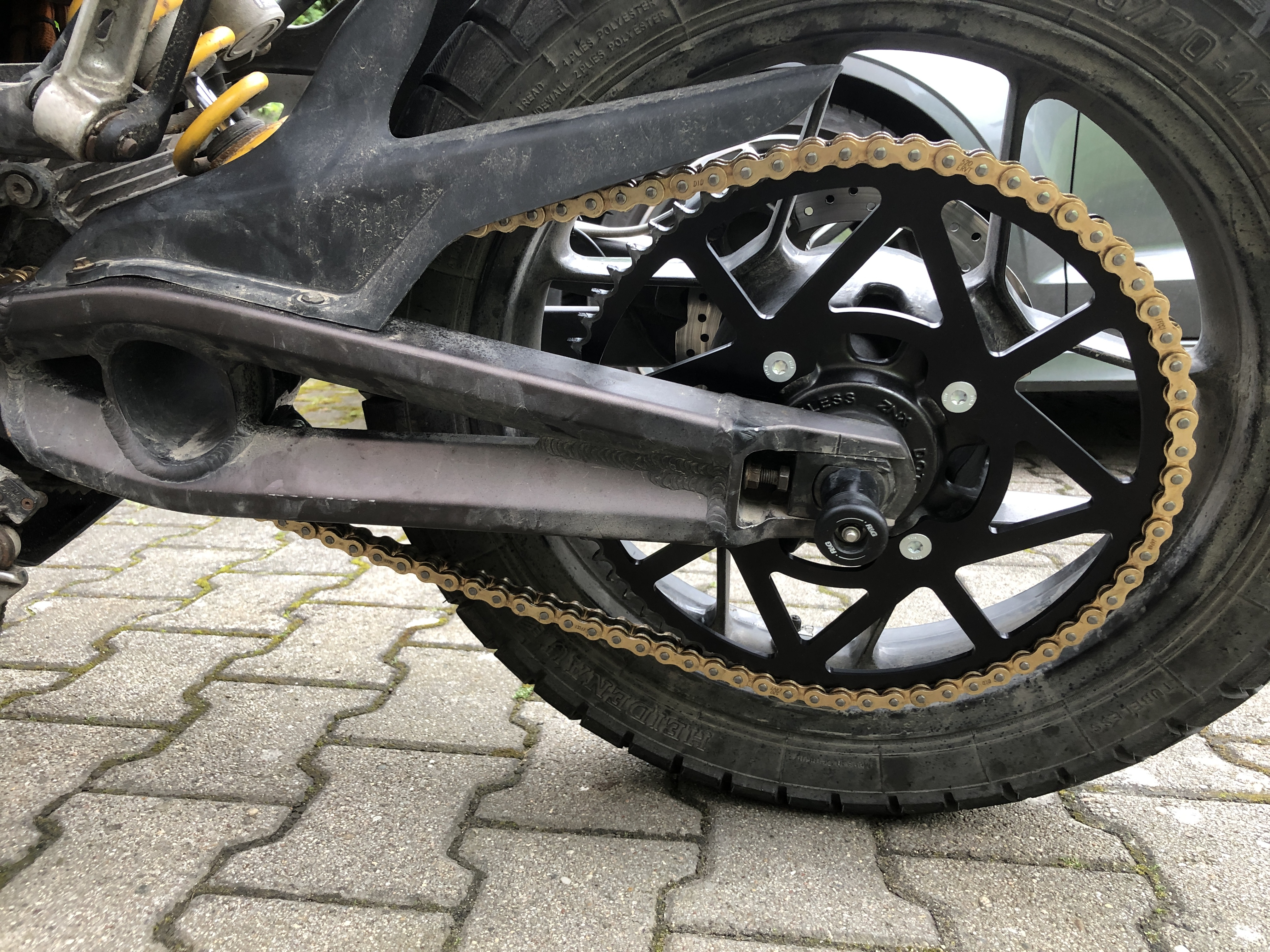 Heute ist es geschehen: Meine alte 2017er "11kW" S hat nun das angeblich passende Zero chain Kit montiert. Flammen waren nötig, um die ganze Kleberei von Riemenrad hinten und Ritzel vorn zu lösen, sagte der Mechaniker (Paul :D ).