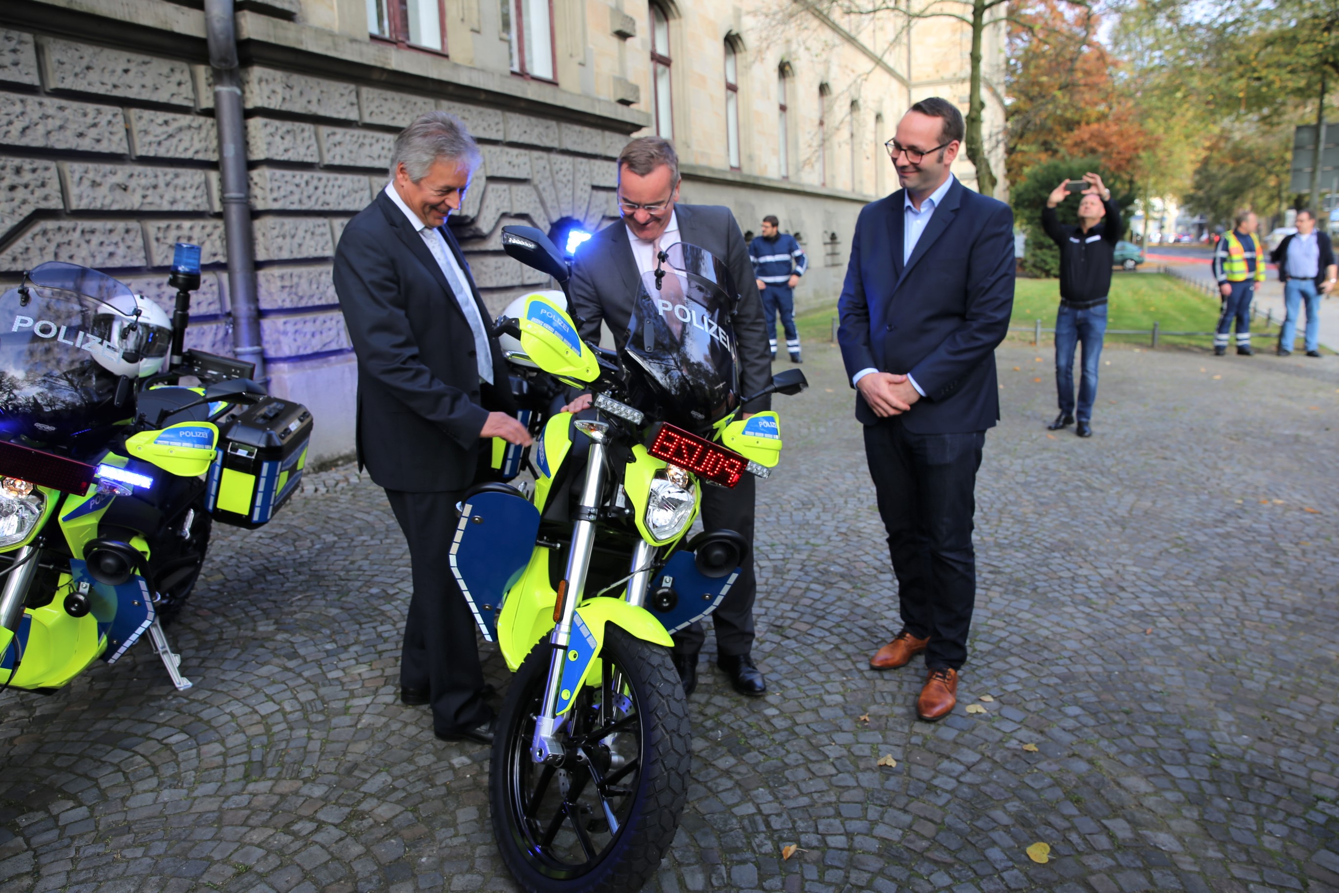 Heute haben wir in Anwesenheit des Präsidenten der Polizeidirektion Osnabrück, Bernhard Witthaut, sowie des niedersächsischen Ministers für Inneres und Sport, Boris Pistorius, die bundesweit ersten beiden Elektromotorräder für den städtischen Einsatz- und Streifendienst in Osnabrück an die Polizei übergeben.
