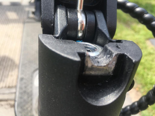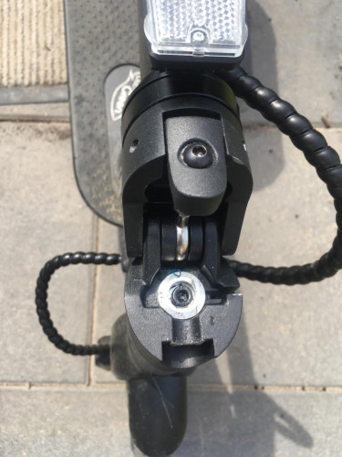 Wahrscheinlich war der Spannbolzen, der quer durch das klappbare Rohr geht, nicht kurz genug eingestellt, so dass der Riegel nicht 100% anlag. Dann hat er z.B. bei einer Bodenwelle oder einer vollen Beschleunigung mit dir am Lenker hängend diesen Metallklotz nach oben abgeschert, was man sehr deutlich an den Kratzspuren sieht.