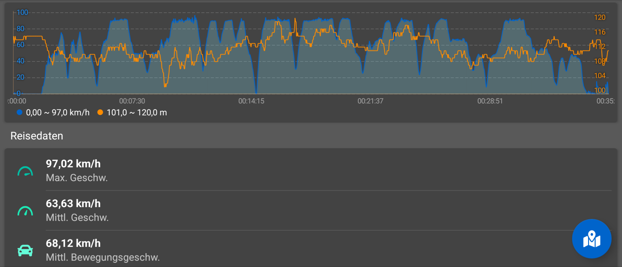 Durchschnittsgeschwindigkeit 67km/h (Das kommt daher das ich wenigstens versuche mich an Verkehrsregeln zu halten)