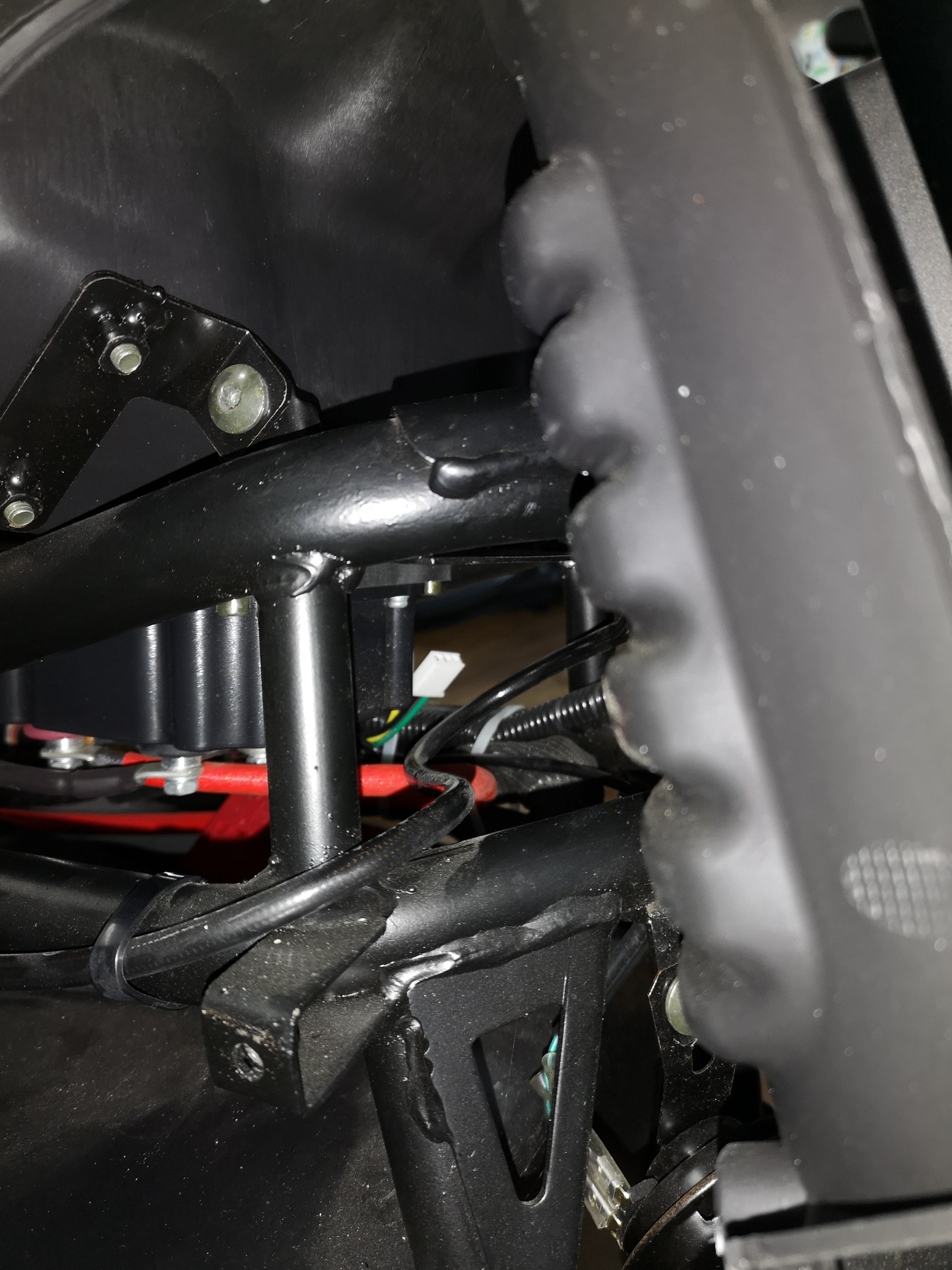 Der DC Converter sitzt unter der Tankattrappe. Dort gibt es einen Stecker (auf dem Foto der weiße Stecker in der Mitte, hier ohne den Converter). Die ankommenden Kabel musst du jeweils mit den vorhandenen und dem neuen DC Converter verbinden.