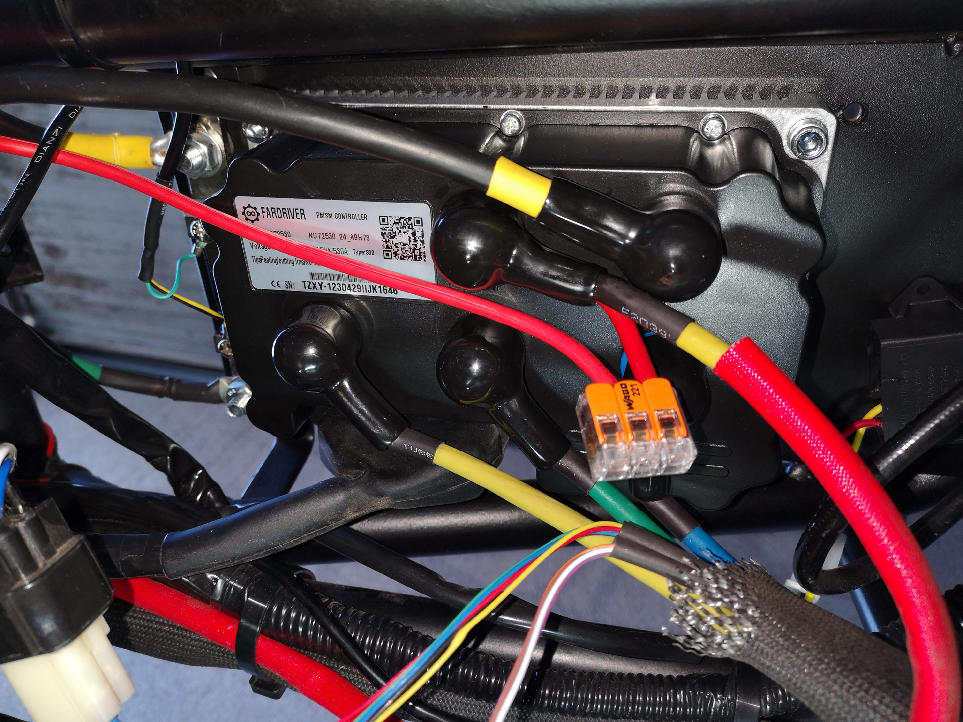 Der neue Controller konnte 1:1 gegen den DY72V150A ausgetauscht werden, lediglich 4 Schrauben M6x30mm waren zusätzlich nötig (weil die lamellierte Kühlplatte vom ND72530 deutlich dicker ist, als vom alten Controller). Außerdem musste das alte Bluetooth-Modul gegen das mitgelieferte, neue Teil ausgetauscht werden (weil sonst die App bei manchen Parametern gemeckert hatte).