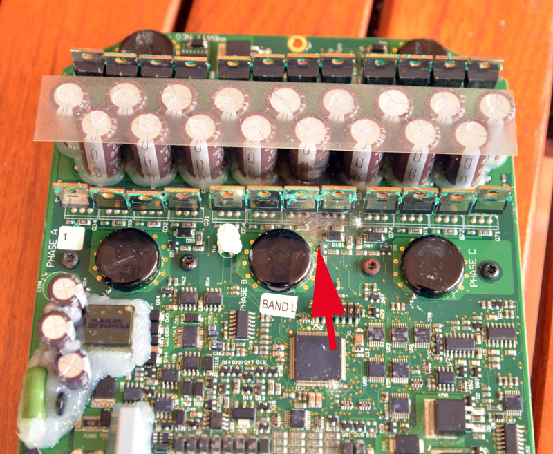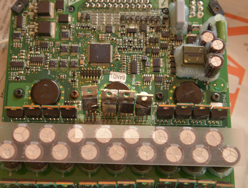Eine kleine mechanische Herausforderung ist es, das Board vom Kühlkörper zu trennen. Dieser hält das Board mit einer 24 Zungen Doppelklammer, die über die kpl Breite des SEVCON gleichzeitig die 24 IRF gegen ihn drückt, siehe auch Bild 2. Da gibt es zwar ein Werkzeug zum Entspannen und festhalten, das habe ich aber nicht. Mit Gewalt abziehen geht natürlich nicht.