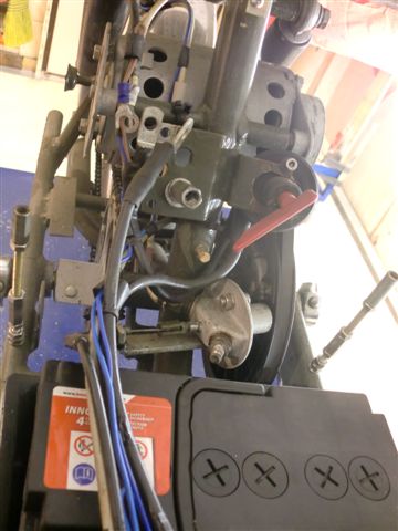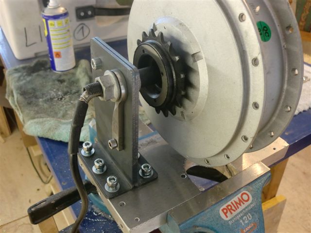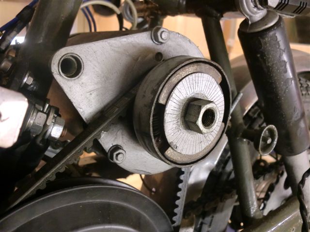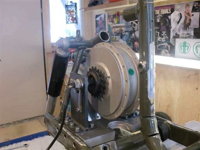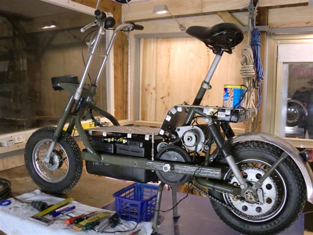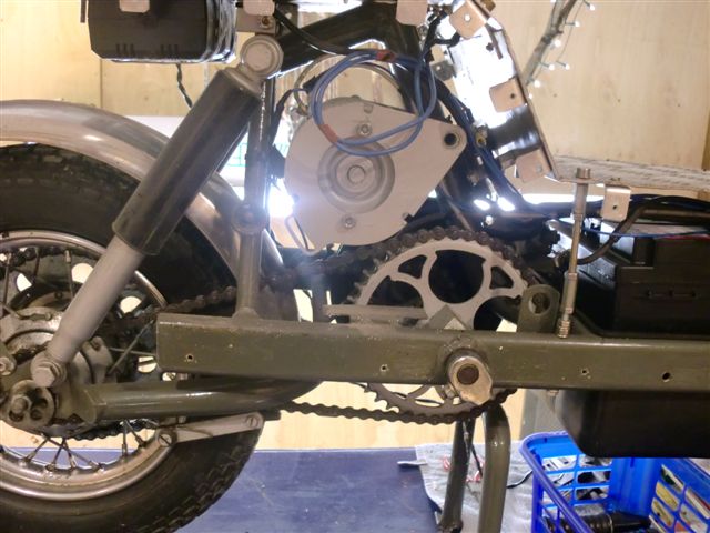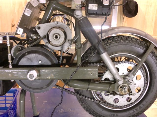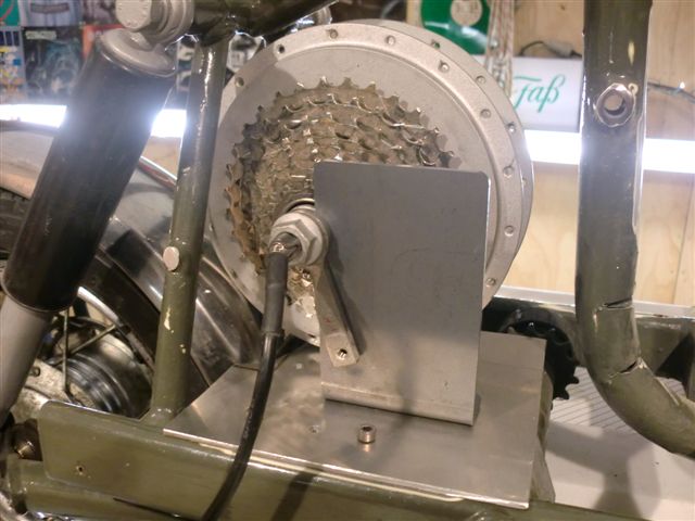 Antrieb-Ausgangszustand: 24V/500W Gleichstromnebenschlußmotor der auf eine Fliehkraftkupplung wirkt. Es fehlt also jegliche Elektronik. Von der Kupplung geht ein Keilriehmen zu einem Zwischengetriebe und dann mittels Kette zum Hinterrad. Die Verluste die sich daraus ergeben sind mörderlich. Ich hab im Leerlauf bei angehobenen Hinterrad 7A gemessen. Einhergehend ist die Geräuschentwicklung auch ziehmlich krass...