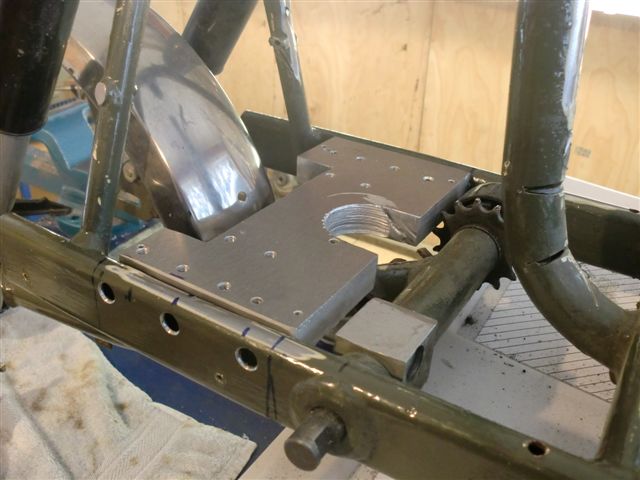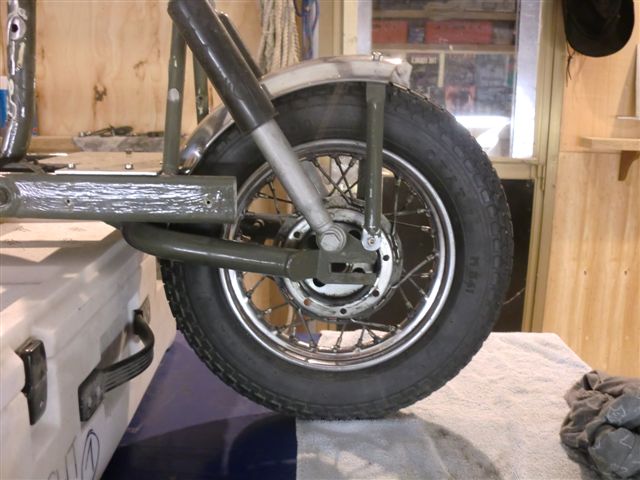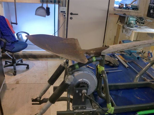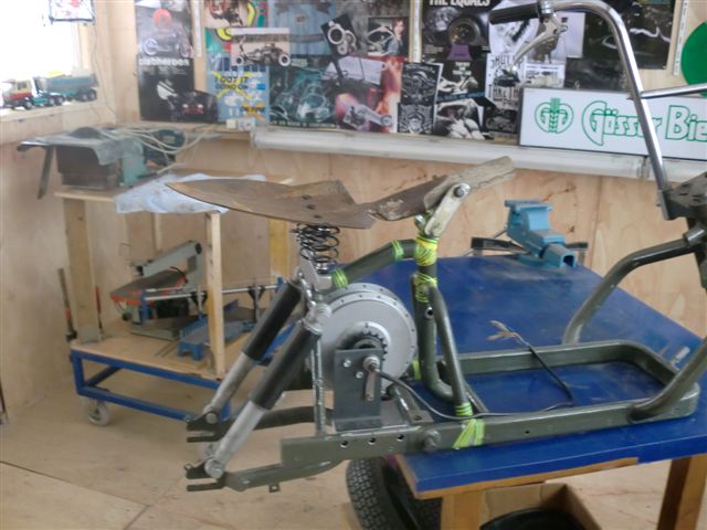 Nun, die Schaufel als Sitz ist eine spontane Idee (sie lag zerbrochen auf der Strasse) Zwei Federn sind vom Originalsattel, die anderen beiden hatte ich noch. Durch den Stiel läuft eine Buchse mit einer M10-Schraube als Gelenk und Führung. Die ersten Sitzproben sind prima gelaufen...