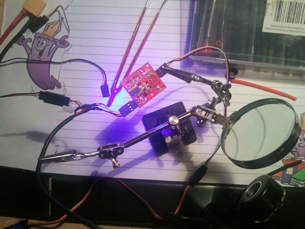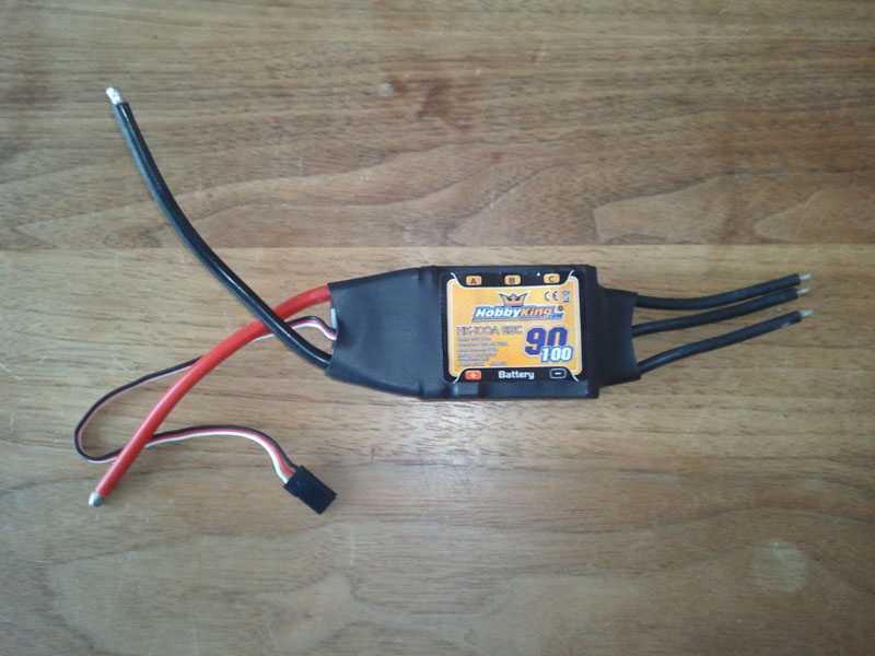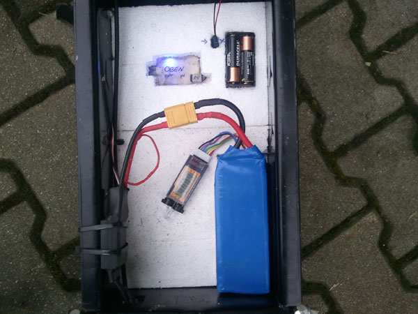 Laut User-Kommentaren auf Hobbyking sollte man tunlichst vermeiden den verwendeten Hobbyking SS 90-100A Regler mit Akkus jenseits der 3S zu programmieren, da er sonst extrem heiß wird und wohl schon des Öfteren abgeraucht sein soll. Hierfür kam kurzerhand ein 2S1P Akku zum Einsatz.