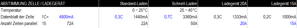 Jede Akkuzelle hat einen sog. C-Wert, der nichts anderes ist, als der Kapazitätswert der Zelle in der Einheit "mAh" (Milli-Amperestunden). Die Belastbarkeit einer Zelle beim Laden und Entladen in der Einheit "mA" (Milli-Ampere) wird ebenfalls mithilfe dieses C-Wertes im Datenblatt angegeben. Dazu wird das "h" einfach weggelassen. Die ersten beiden Spalten der Tabelle zeigen folglich, dass mein mit 15 Zellen parallel bestücktes Akkupack bis 22A im moderaten Standardbereich (0,3C) geladen werden kann und bis 50A Schnellladen (0,7C) noch erträgt. Die letzten beiden Spalten zeigen dann in welchem Bereich ich mich befinde bei Auswahl eines 20A- bzw 15A-Ladegerätes. Man sieht also, dass beide Ladegeräte noch im moderaten Standard-Ladebereich 0,3C betrieben werden könnten.